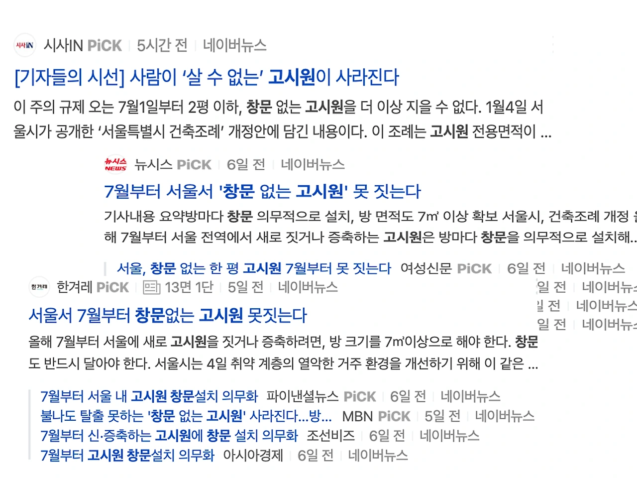 지난 4일 서울시는 ‘2평 이하의 창문 없는 고시원’을 법적으로 제한한다고 발표했습니다. 아무리 최소 공간으로 최대한의 효율을 내기 위한 목적으로 만들어진 고시원이라고 해도 ‘인간’이 살아가는데 필요한 정도에 대한 규제를 가한 것이죠. 서울시 건축조례에 따르면 일정한 일조량과 환기를 가능케하는 창문이 방마다 1개씩은 있어야 하며, 2평을 생활에 최소 조건으로 명시했습니다.