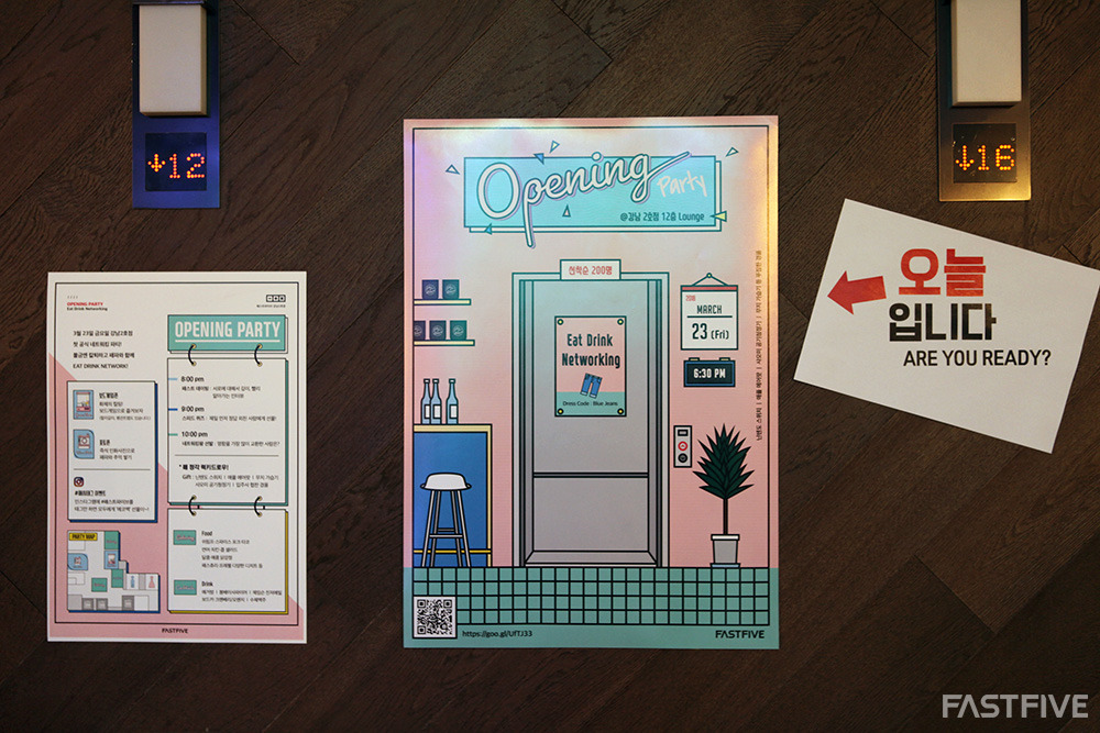 공유오피스 패스트파이브 강남 2호점은 강남역 4번 출구를 나오자마자 보이는 미왕빌딩에 위치해 있습니다. 오늘 파티가 열리는 장소는 바로 12층 메인 라운지입니다! 엘리베이터 옆에 부착된 파티 포스터가 우리를 반갑게 맞아주고 있네요.