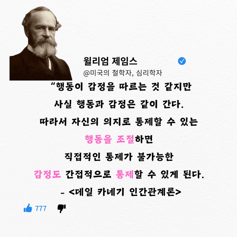 그래서 윌리엄 교수님은 행동을 통해서 감정을 조절할 수 있다는 것이죠.