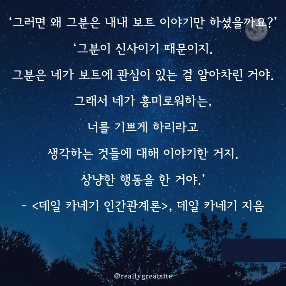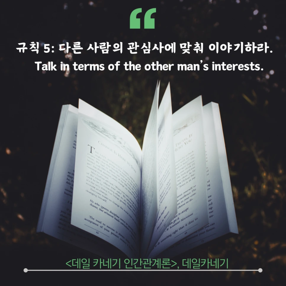 데일 카네기는 다른 사람의 관심사에 맞춰 이야기하면 사람들이 좋아한다고 말합니다.