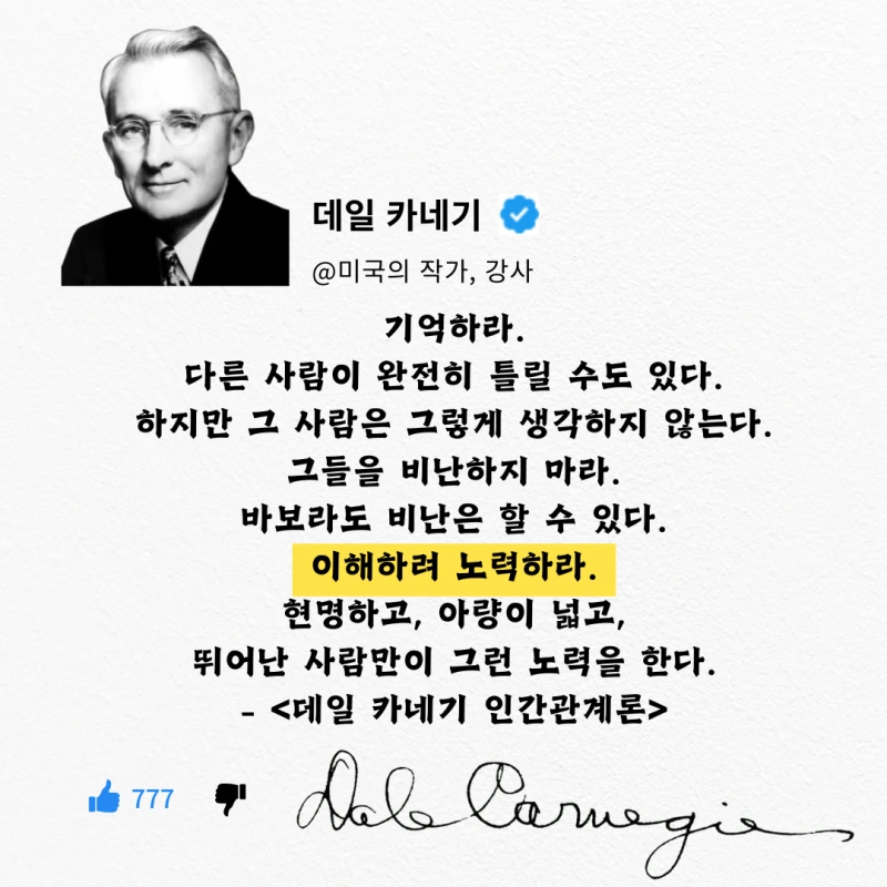 데일 카네기는 비난하기는 쉽지만, 이해하려고 노력하는 것이 현명하다고 합니다.