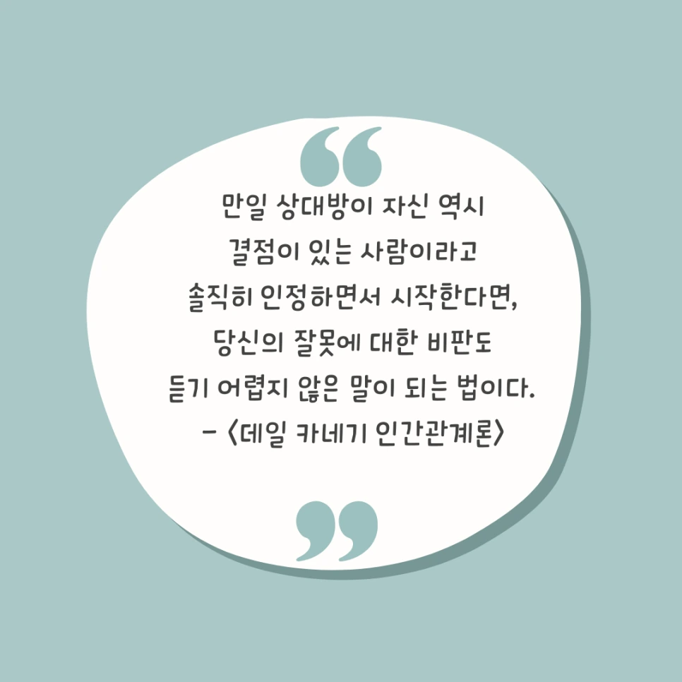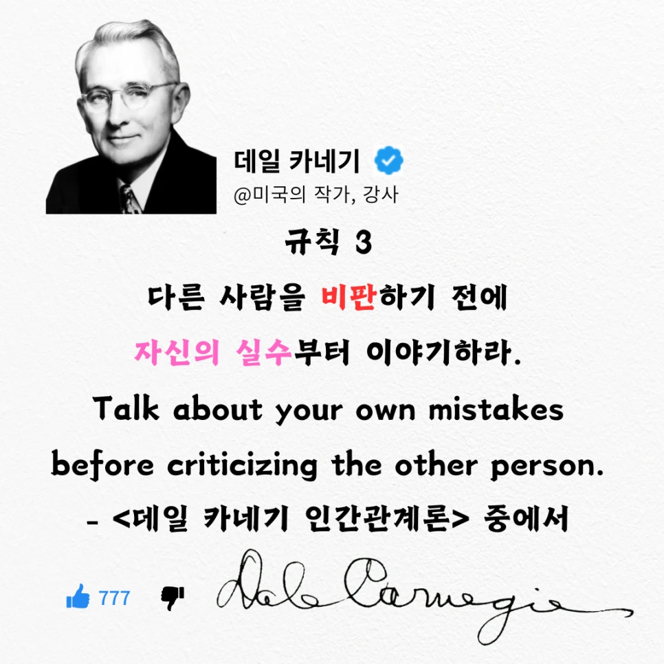 오늘은 <데일 카네기 인간관계론> 4부 3장 '자신의 잘못에 대해 먼저 이야기하라'에 대해서 이야기하겠습니다.