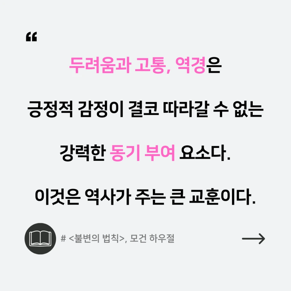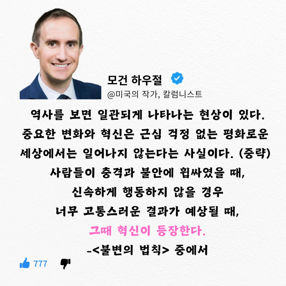 모건 하우절은 역사에서 반복되는 불변의 법칙을 말합니다. 난세에 영웅이 나타나듯, 고통스러운 상황에서 혁신이 등장합니다.