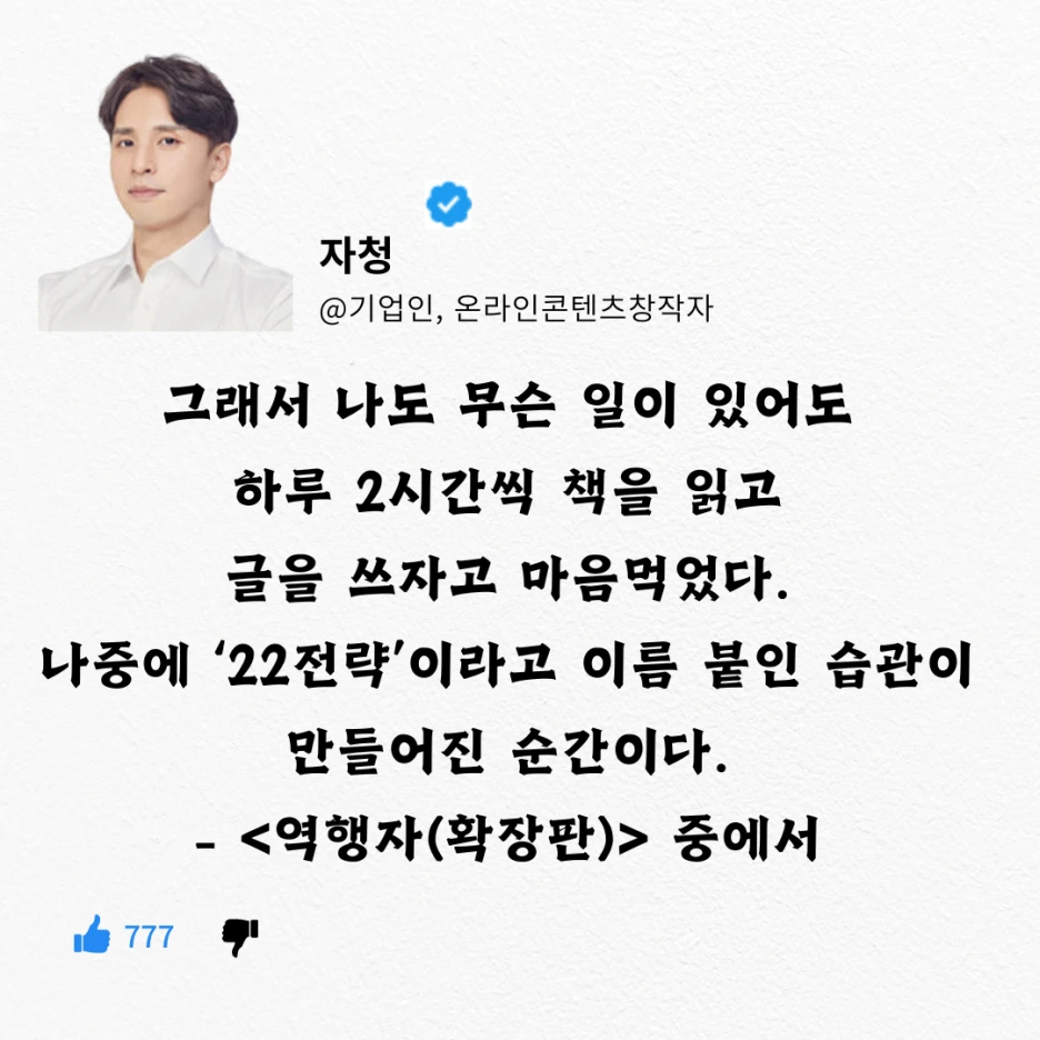 여기서 22 전략이란 2년간, 매일 2시간씩 책을 읽고 글을 쓰는 것을 말합니다.