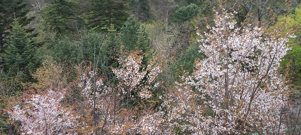 절 아래엔 아직 분홍 벚꽃이 남아 있어.
