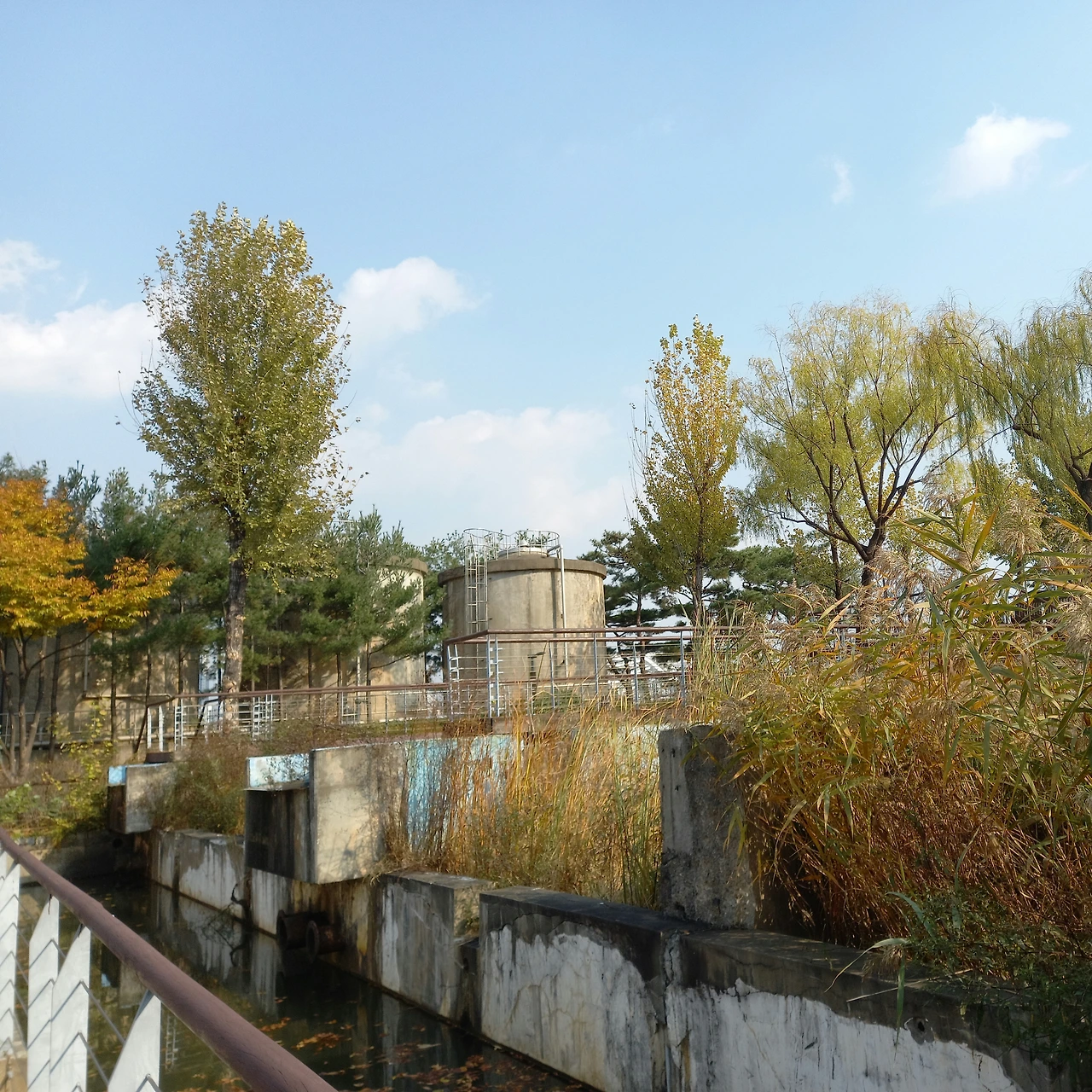 녹슨 기계의 잔재들과 낡은 시멘트 구조물 사이에 나무와 풀이 자라고.