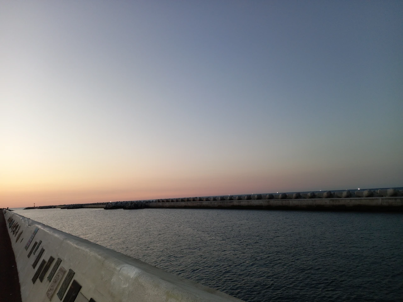 부두를 따라 불 켜진 가로등과 큰 바다로 나가는 불 밝힌 어선들.