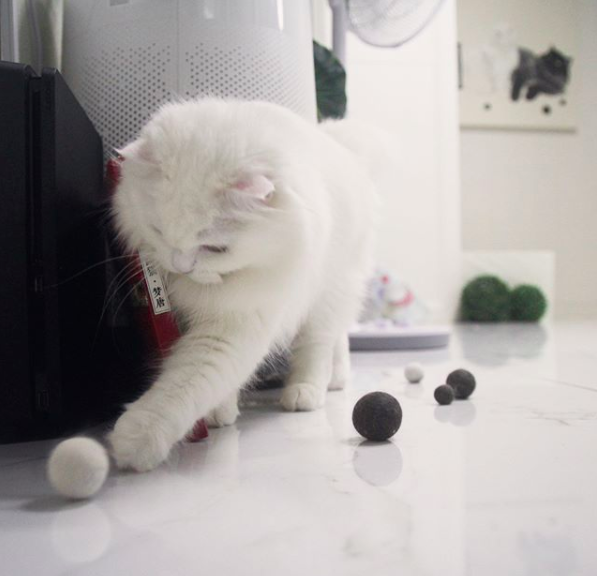 만드는 방법도 어렵지 않다. 마리와 라리같은 장모종은 털을 조금만 빗어줘도 엄청난 양의 털이 나오기 때문에 이를 소똥구리가 똥 굴리듯 손으로 힘껏 뭉쳐나가면 금세 단단하고 동그란 공이 만들어진다. 집사들 사이에선 ‘털공’이라고 부르는 이 공은 적당한 탄성도 있어서 바닥이나 벽에 튕기고 있노라면 어느새 마리가 와서 개구 호흡을 할 때까지 가지고 논다. 돈도 안 들고, 털도 빗어주고, 장난감도 생기고 일석삼조의 좋은 방법이다.