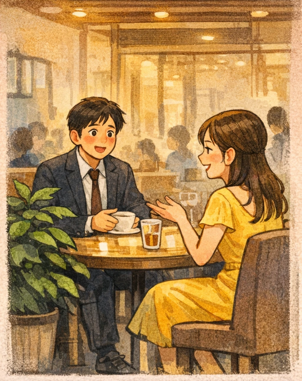그때 하늘거리는 노란색 원피스를 입은 예쁜 여자가 카페 문을 열고 들어왔다. 카페에 앉은 많은 사람들이 여자를 바라보았다.