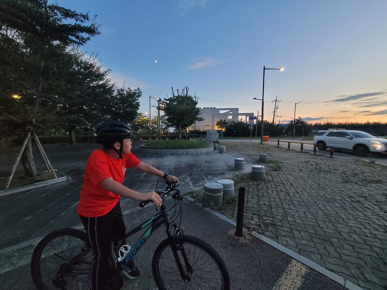 그 무서움과 서투룸을 극복하기 위해 매일 저녁식사 후 자전거 연습을 하러 갔다. 자전거는 식사 후에 타더라도 러닝처럼 배가 아프지 않아서 좋다. 둘째 아들이 매일 나와 함께 했다. 초등학교 4학년인 현수는 작년에 두 발 자전거를 형아한테 배웠다. 매일 자전거로 등하교를 하고, 매일 자전거를 타러 나가니 자전거를 능숙하게 잘 탄다. 두 손을 놓고 자전거를 타는 모습은 정말 신기하다. 나는 자전거를 타는 도중에 안경을 올리려 한 손을 떼는 것도 쉽지 않은데... 아이가 함께 자전거를 타면서 옆에서 이런저런 팁을 알려준다. 부모 눈에 막내는 아무리 커도 어리게 느껴지는데.. '언제 저렇게 컸지?'..라는 생각이 든다.