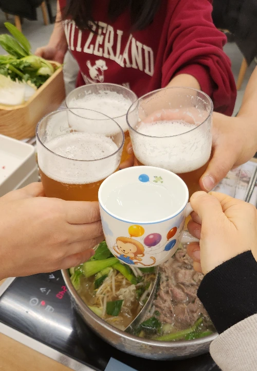 우리는 잔디에 풀어놓은 강아지들처럼 음식들 코너를 기운차게 이용했다. 말 그대로 신이 났다. 동생 중 한 명은 "여기서 술로 배울 채울 수 없다" 하면서 맥주를 아끼고 고기와 좋아하는 버섯을 냄비에 가득 넣고 야무지게 보글보글 끓였다. 두 친구는 접시 한 번 비울 때마다 잔도 비워졌다. 이렇게 음식이 무제한이니 1차, 2차, 3차를 갈 필요가 없었다. 배고프니 식사, 고기종류로 든든한 밥류로 1차를 하고 해물과 튀김, 피자, 치킨으로 2차를, 3차는 샐러드, 요거트와 과일로 아주 야무지게 마무리하고 알차게 먹었다. 먹다 주위를 둘러보니 그 많던 손님들이 싹 사라지고 우리를 포함해 세 테이블이 남아있다.