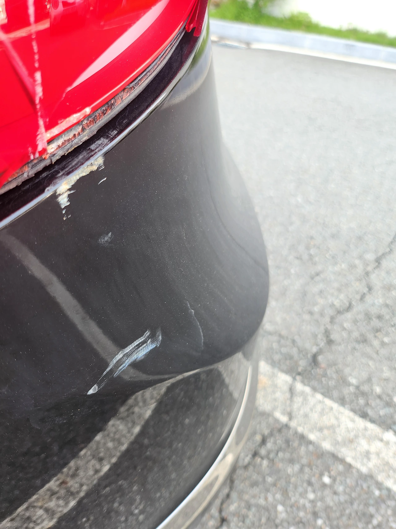 우선 라이트가 깨져있었어요. 그것도 모르고 신나게 달려서 그런지 라이트 조각이 떨어져서 구멍이 수웅 뚫려있었어요. 뒷 범퍼 상처는 두 군데로 위아래 있어요. 그중 하나는 손목시계정도 되는 크기로 푹 들어가 있어요...