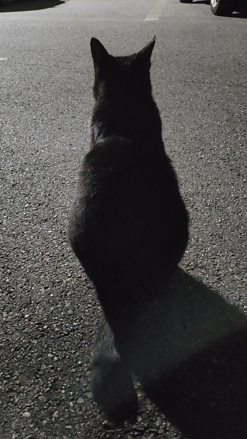 차들 사이로 조용히 지켜보고 있는 검은 물체. 누구냐 넌. 고양이다.