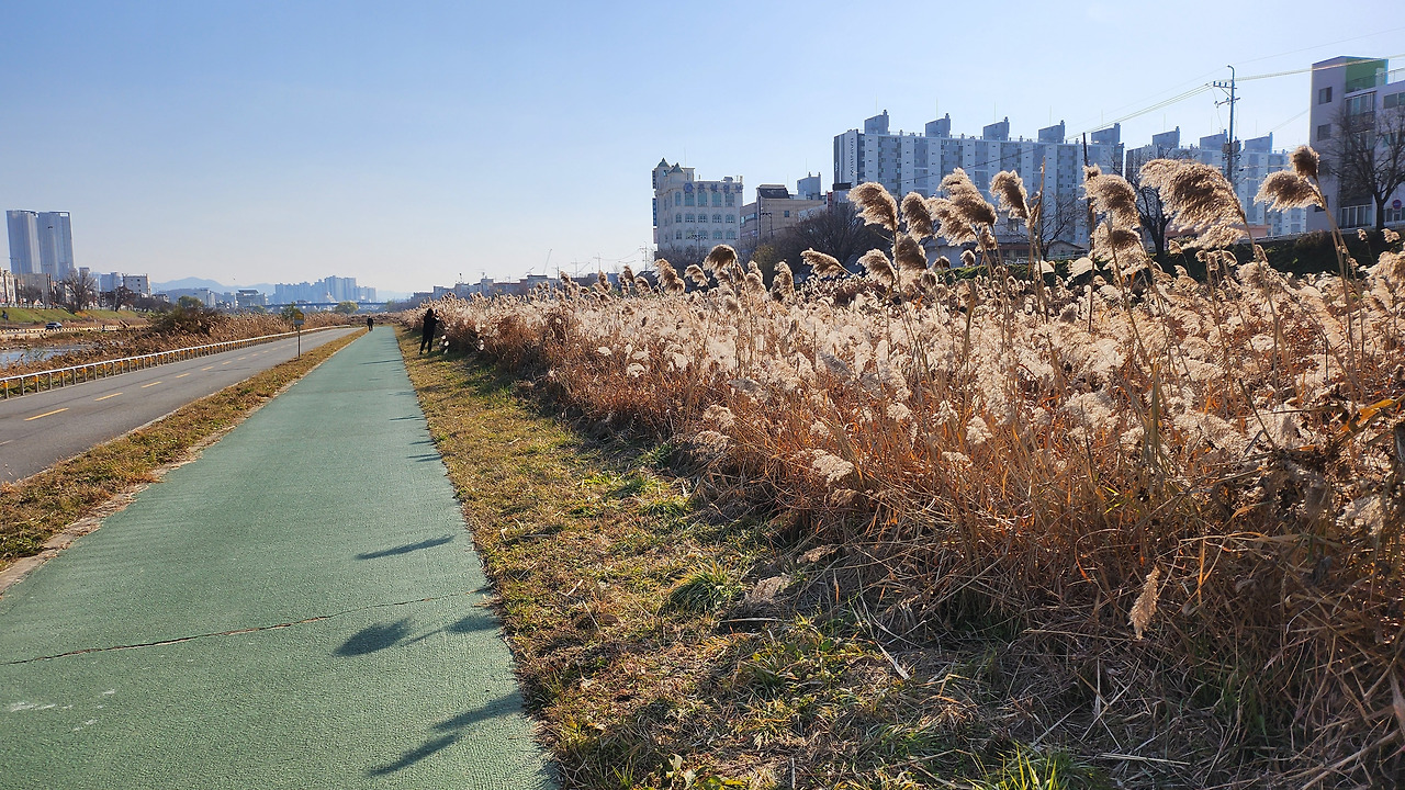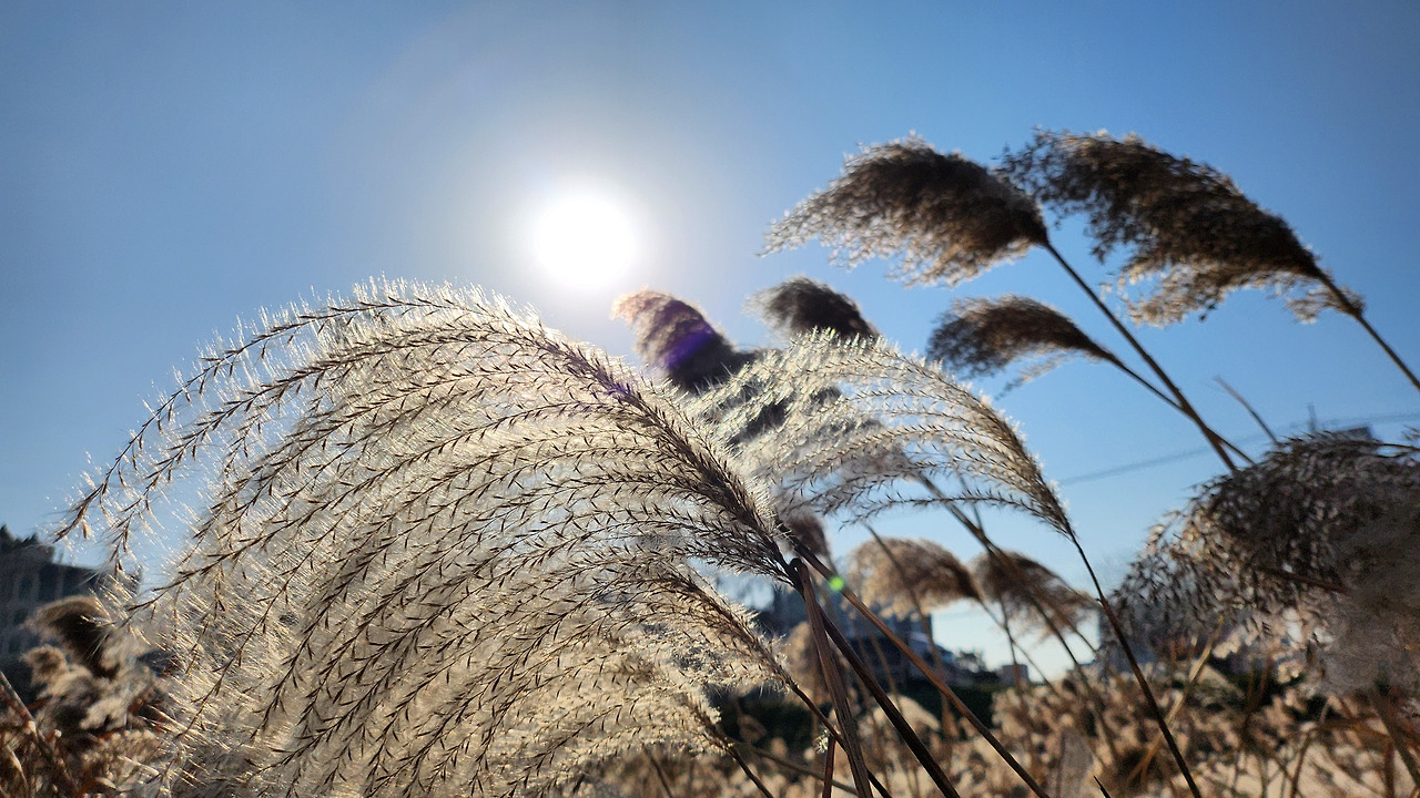 햇빛좋은 날. 어느 길. 행인들에게 인사하며 반기는 억새