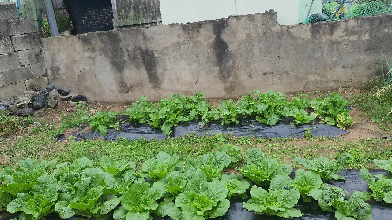 남편이 올해 키우고 있는 배추.무우.파.잘 커야 올해도 김장 할텐데~