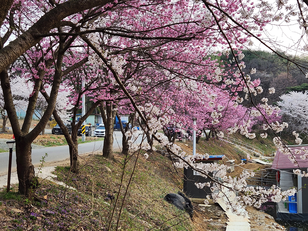 이 동네의 꽃 소식은 소셜미디어를 통해 빠르게 전해졌다. 당일에 바로 벚꽃 길은 온통 봄 꽃 마중을 나온 사람들로 북적거렸다. 특히 저수지 낚시터 가장자리에 있는 벚나무는 짙은 꽃분홍색과 연한 분홍색이 적당히 뒤엉켜 있어 형용이 쉽지 않은 아름다움으로 저수지 물빛에 투영되었다.