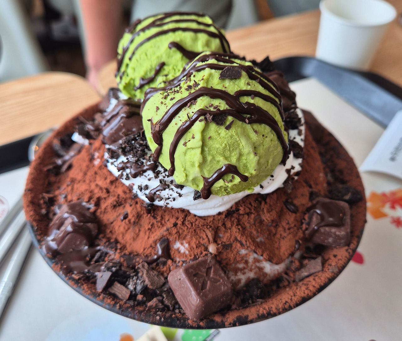 겉보기엔 그냥 ABC초콜릿 같아 보이는 초코과자는 이 빙수의 차밍포인트다. 심지어 별로 안 단데 식감은 또 매력적이어서 계속 집어먹게 되는 부작용을 초래한다. 문제는 초코과자 뿐만이 아니다. 빙수 위에 얹어진 녹차 아이스크림은 녹차러버인 나의 심금을 울린다. 우유 베이스로 추정되는 빙수에 여러 가지 토핑을 바꿔가며 맛보다 보면, 어느새 한 그릇 뚝딱이다. 사람의 마음을 살살 녹이는 아주 위험한 디저트다.