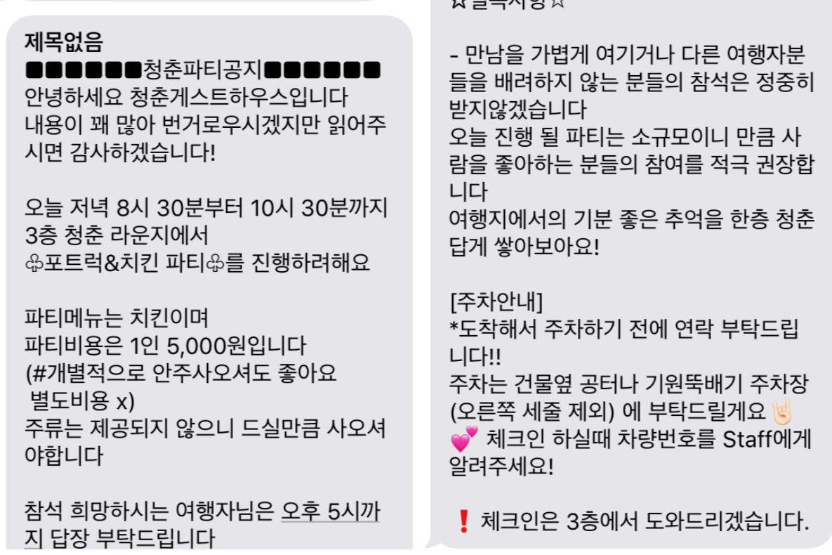 청춘게스트하우스는 파티 게스트하우스로 유명한 곳이었다. 매일 밤 저녁 8시 반이면 라운지에서 치맥 파티를 열고 서로 모르는 게스트들이 친해질 수 있도록 분위기를 띄우는 게 스태프들의 주요 미션이었다. 인원이 적으면 스태프가 직접 참여해 남녀 성비를 맞추기도 했다. 2시간 동안의 파티가 끝나면 마무리 청소를 한 후 청춘들을 2차 장소에 데려다주는 것으로 스태프의 하루가 마무리 됐다.