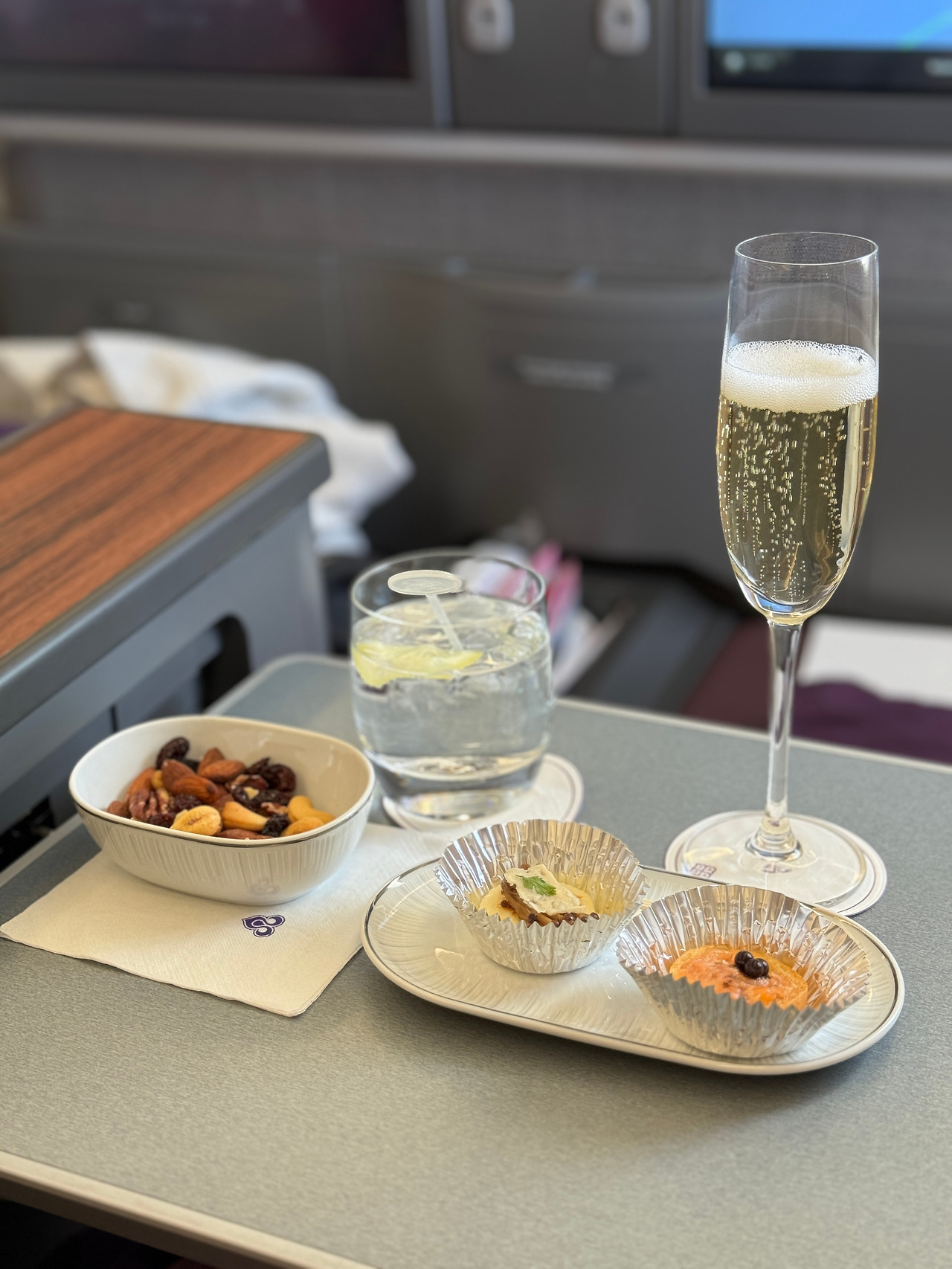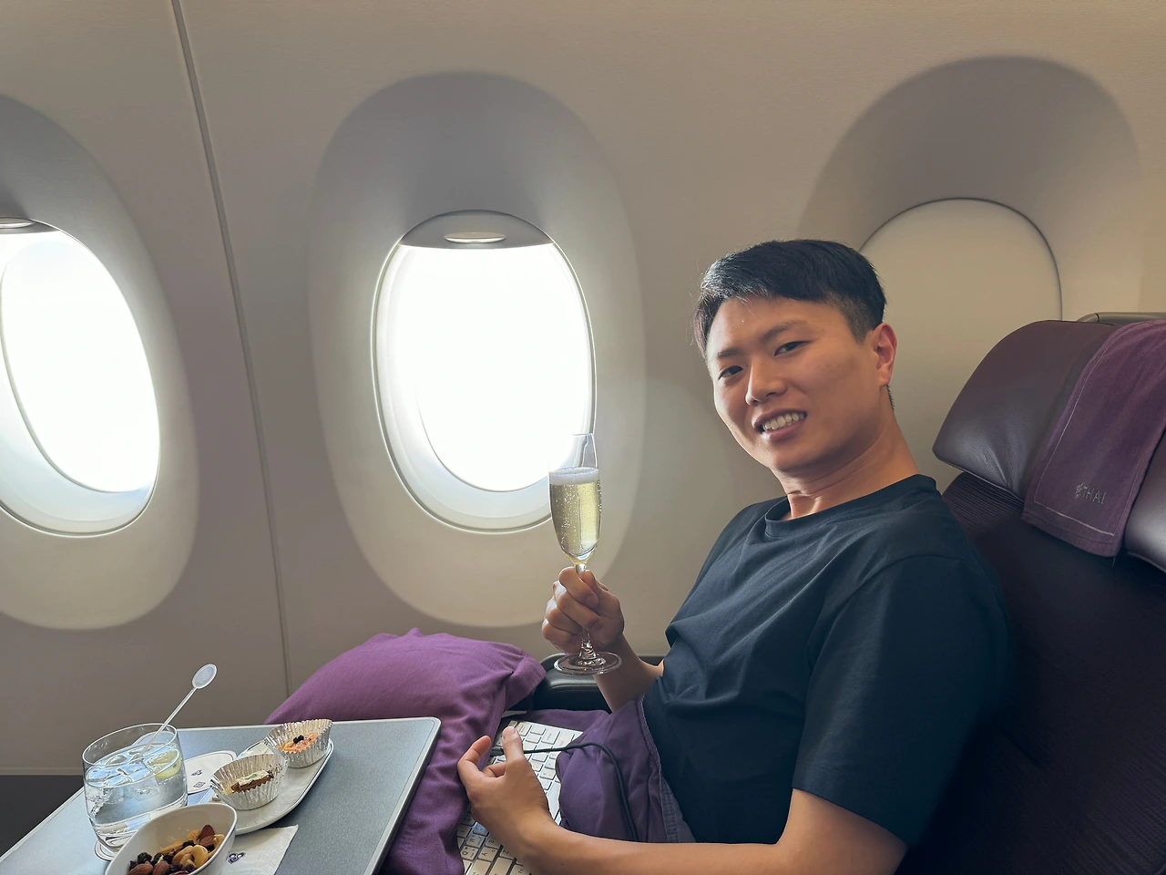 자리에 앉으니 승무원이 오늘 담당하게 된 엘리스라며 소개를 하고는 웰컴 드링크를 물었다. 샴페인을 골랐더니 직접 자리에서 샴페인을 따라주고는 이륙 후 간식과 아뮤즈부쉬를 가져다주었다. 생전 처음 먹는 아뮤즈 부쉬에 신나서 연신 사진을 찍어댔다. 그 모습이 재미있었는지 옆자리에 앉은 외국인이 내 사진을 찍어준다며 핸드폰을 달라고 했다. 그러고는 승무원에게 애피타이저도, 빵도, 식사도 먹지 않는다고 말하곤 바로 잠들어버린 그. 언젠가 저렇게 비즈니스석에 무딘 사람이 되겠다 다짐했다.