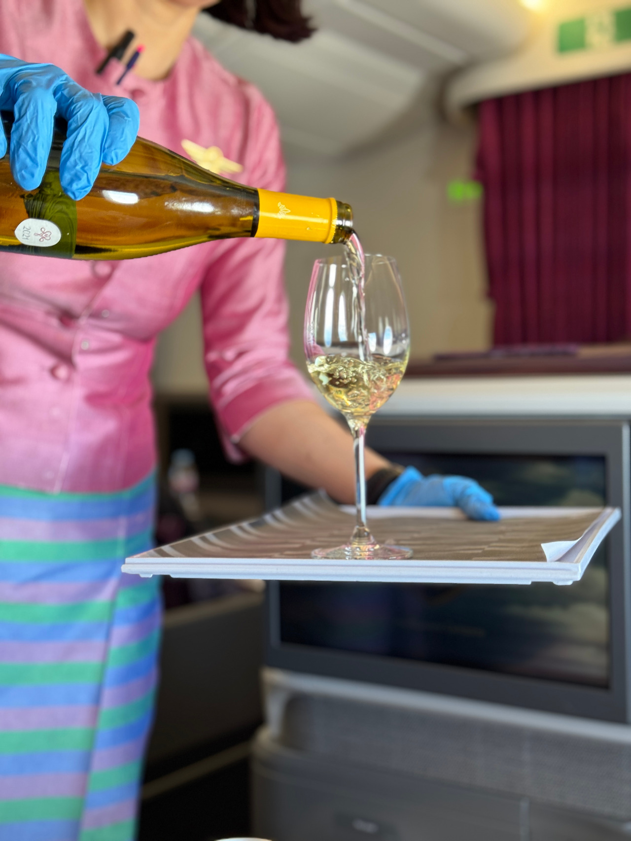 웰컴드링크에 이어 나온 빵과 샐러드, 그리고 메인 스테이크, 디저트까지. 일반 기내식과 달리 접시에 담겨 나오는 게 고급 레스토랑 코스요리가 부럽지 않았다. 밥을 먹고 나니 기내를 어둡게 하고 휴식을 준비해 줬다. 하지만 이 짧은 순간도 아쉬워 와인에 칵테일에 타이티맛 아이스크림까지 주문해 먹었다. 5시간의 비행에 샴페인도 몇 잔을 마셨는지 모른다.