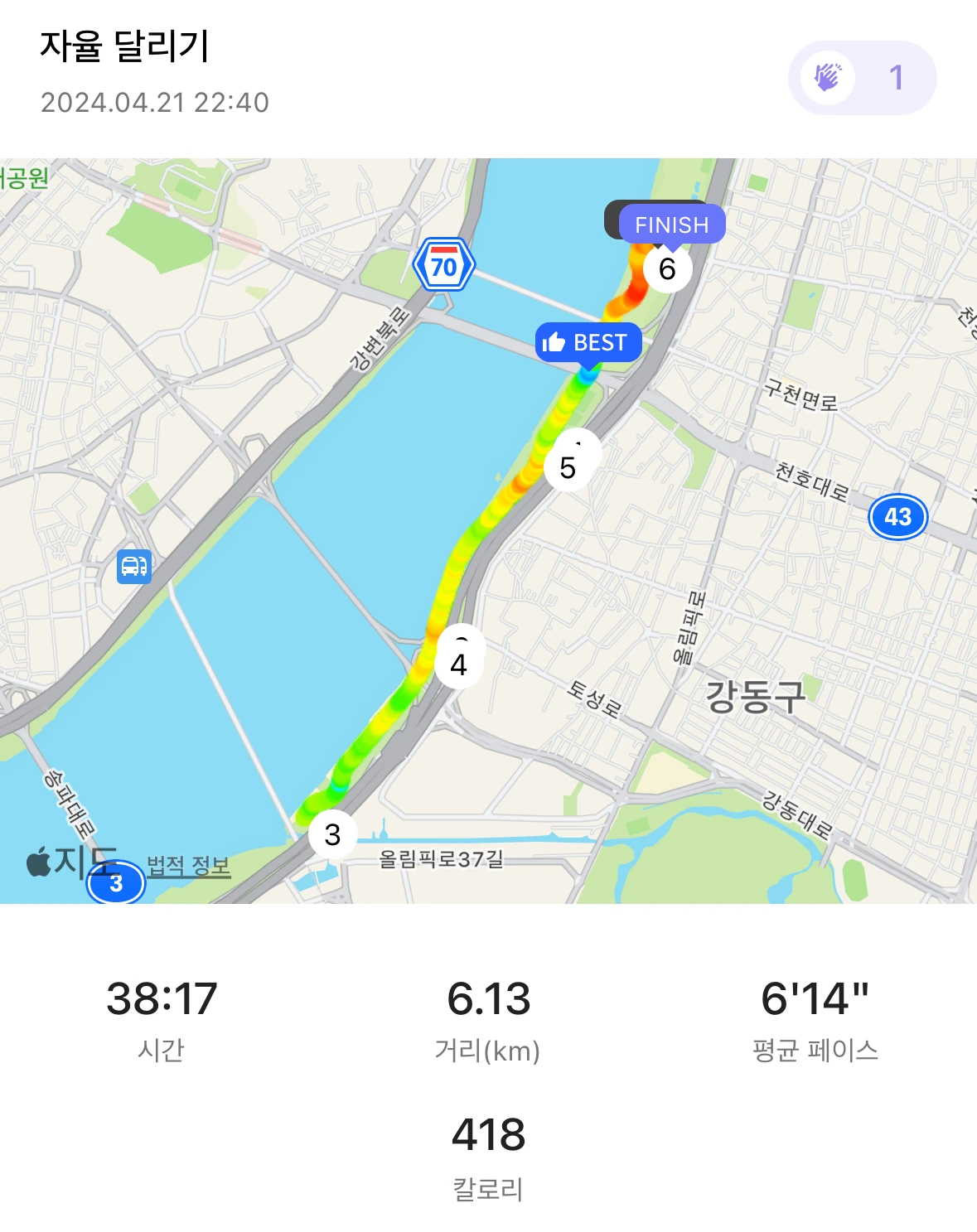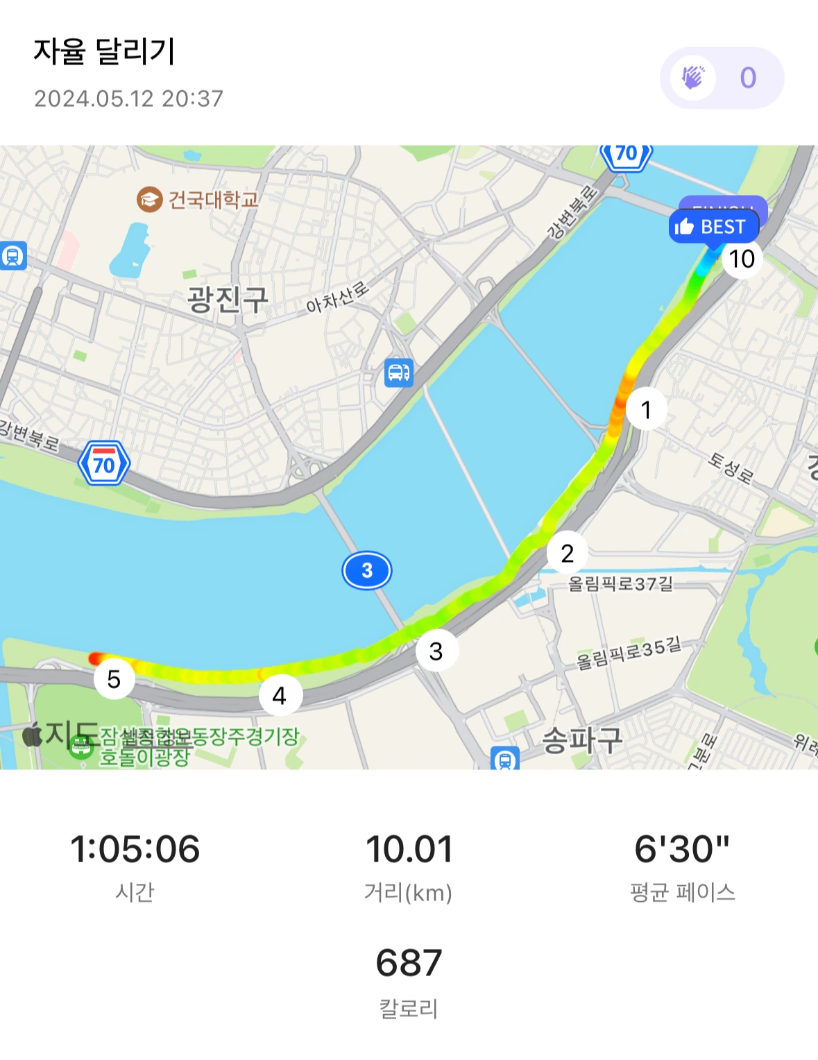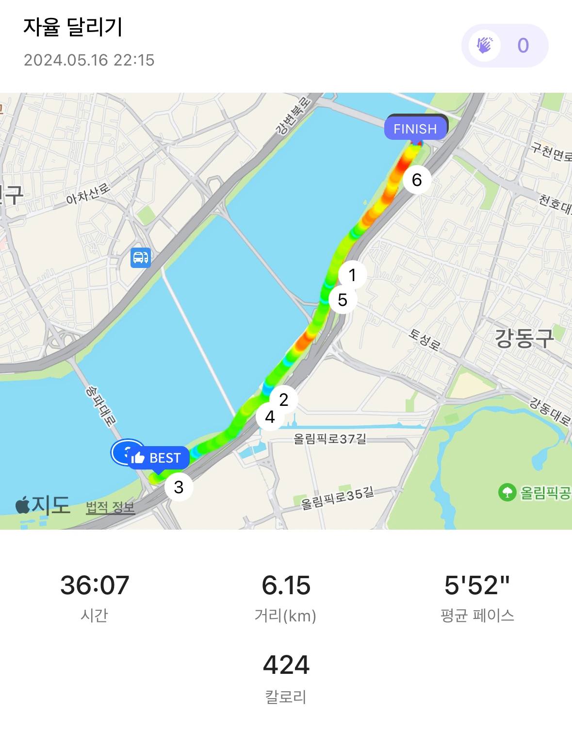 공원을 달리는 느낌과 한강을 달리는 느낌은 확연히 달랐다. 강바람을 맞는 기분, 멀리 계속 바뀌는 한강의 야경을 보는 기분은 정말 상쾌했다. 이 날은 처음으로 6km를 뛰었는데, 페이스도 6분 초반대로 꽤 올려 뛰어 스스로가 대견할 정도였다. 한강에 앉아 치맥을 하는 인파들 사이를 뛰어가며 마치 갓생을 사는 듯한 뿌듯함도 느낄 수 있었다. 막차를 놓치고 겨우 N버스를 타고 집에 가게 됐는데, 기분은 오히려 좋았다.