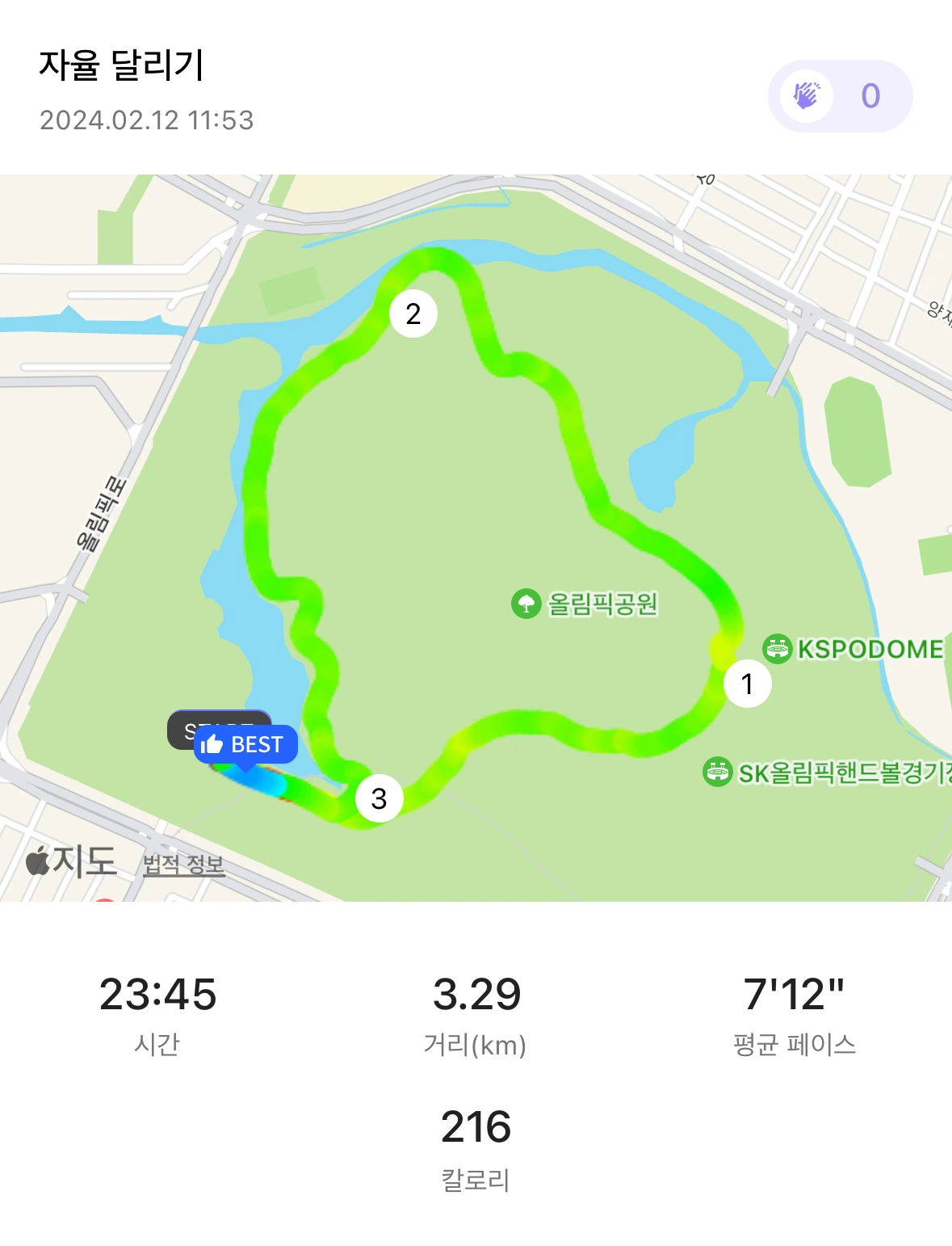 3km는 딱 올림픽 공원 한 바퀴 정도 되는 거리였는데, 7분 12초 정도의 페이스로 23분 정도를 달렸다. 처음 러닝은 꽤 힘들 거라고 했지만, 그래도 꾸준히 헬스장을 다닌 효과였는지 생각보다 어렵지 않았고, 묘한 경쟁심도 생겨, 마지막에는 전력질주를 하며 "내 체력 좋아"를 굳이 굳이 보여주던 나였다. 러닝하이라는 표현이 있다고 했는데, 왜 러닝에 중독되는지 조금은 알 것 같았다. 고작 20분을 뛰었지만 말이다.