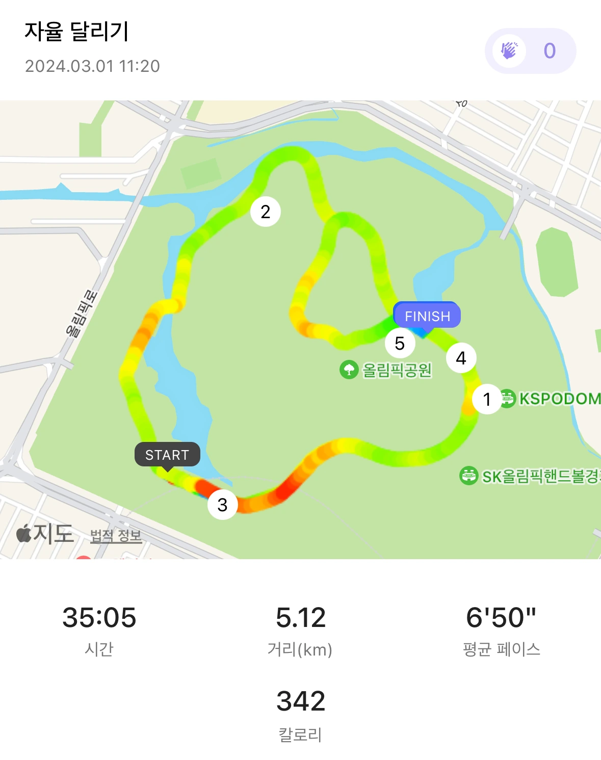 지난번에 비해서 날이 더 풀려서인지, 더욱 많은 러너들이 있었다. 게다가 무슨 행사를 하는지 응원하는 사람들과 반환점까지 표시되어 있었다. 이날 달린 거리는 5.12Km, 평균 페이스는 6분 50초. 확실히 3km에 평균페이스 7분에 비해 힘이 많이 들었다. 팀원 중 몇 명은 중간에 걸을 정도였다. 분명 처음보다 힘들긴 했지만, 생각보다 할만했다. 어쩌면 마라톤에도 나갈 수 있지 않을까, 무모한 꿈을 꿨다.