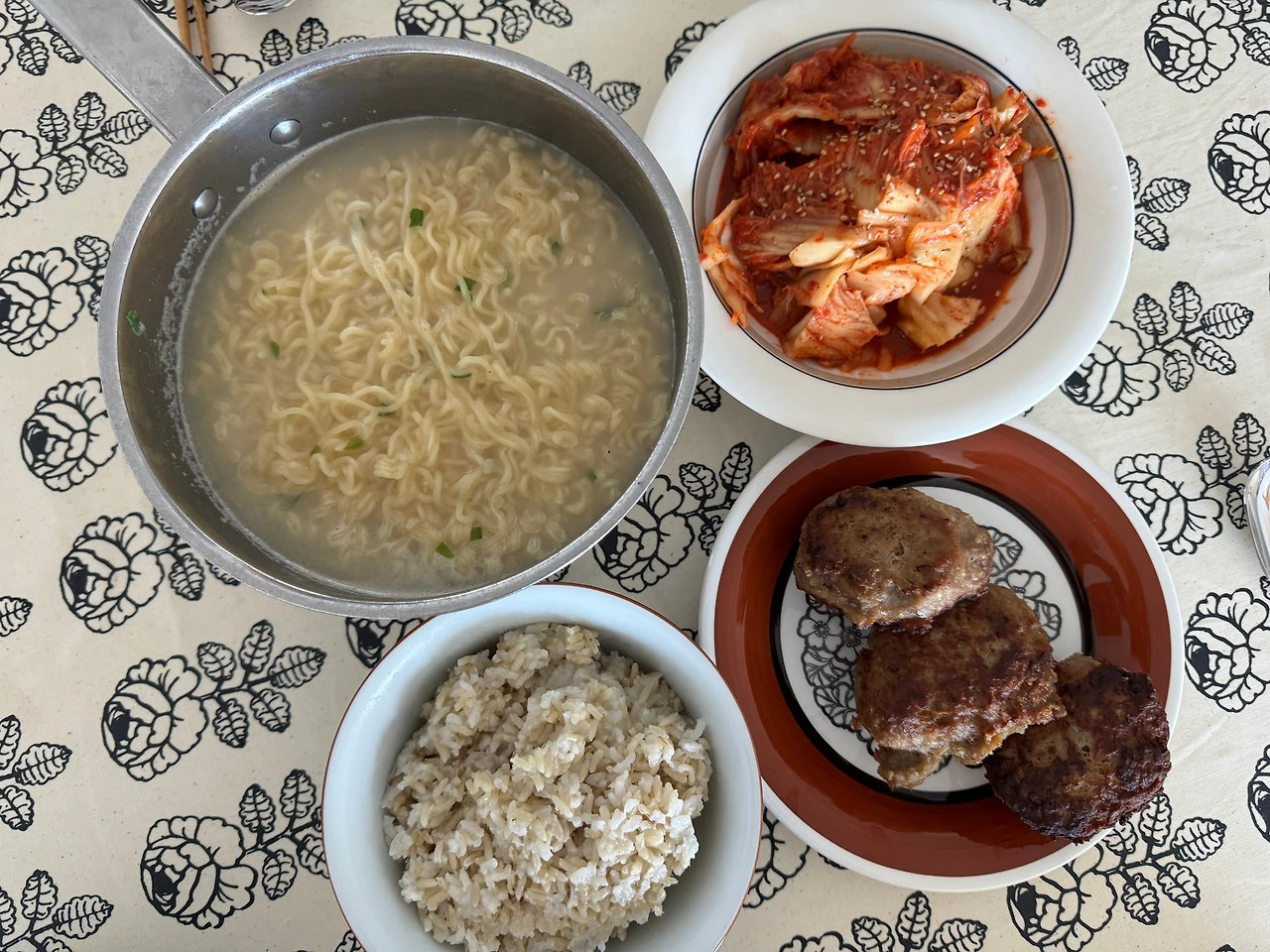 빨래를 마치고 집에 오자마자, 친구는 정성스레 점심을 차려주었다. 밥솥으로 새 밥을 짓고 직접 담근 김치에 한국에서 사 온 사리곰탕까지, 금세 뚝딱 차려진 근사한 한상이었다. 제대로 잠도 못 자서 힘들 텐데 고마울 따름이었다. 후식으로 납작 복숭아까지 먹으니 행복감이 차올랐다.