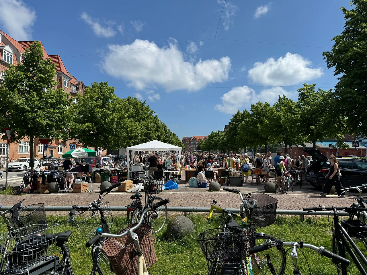친구는 밥을 먹으면서도 동네에 갈만한 곳을 계속해서 알려줬는데, 마침 오늘 일주일에 한 번 열리는 벼룩시장이 열리고 있다고 했다. 점심을 먹고 좀 쉴까 했지만 오르후스 벼룩시장을 볼 마지막 기회라는 생각에 서둘러 옷만 갈아입고 밖으로 나갔다. 날씨가 유독 좋아서 거리만 걸어 다니기만 해도 기분이 너무 좋았다. 파란 하늘과 초록색 나무, 갈색의 집이 어우러진 풍경이 영국과는 또 다른 새로운 유럽의 느낌이었다.