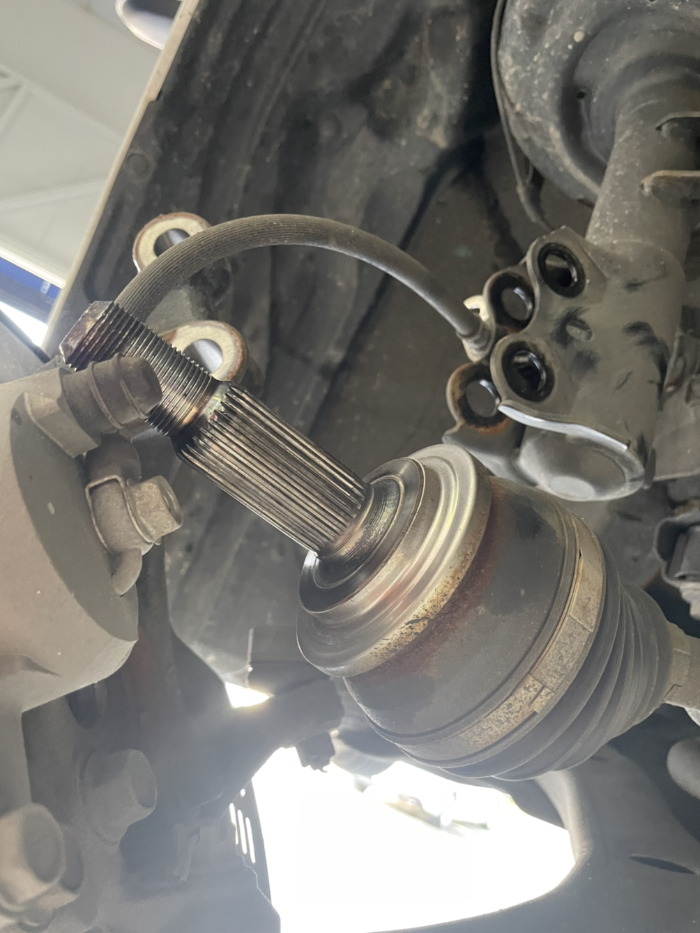 차량을 올리고 천천히 분해에 들어갑니다. 바퀴를 떼어내니 등속조인트가 잘 보입니다. 다행히 찢어진 부위는 없습니다. 무언가 방울이 떨어집니다. “누유 아닌가요?” 물어보니 한참 살펴보시더니 “에어컨디셔너 트셨죠? 그 물입니다.”라고 하십니다. 잠시 후 미션 오일을 빼내셨습니다. 붉은 투명색(?)이었는데 좋은 건지 모르겠네요.ㅋ