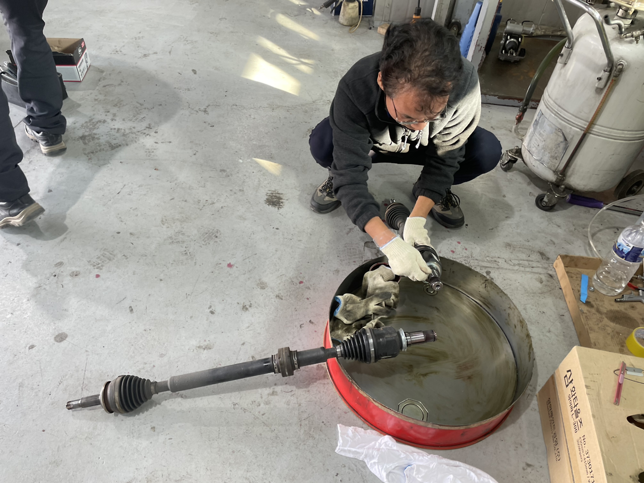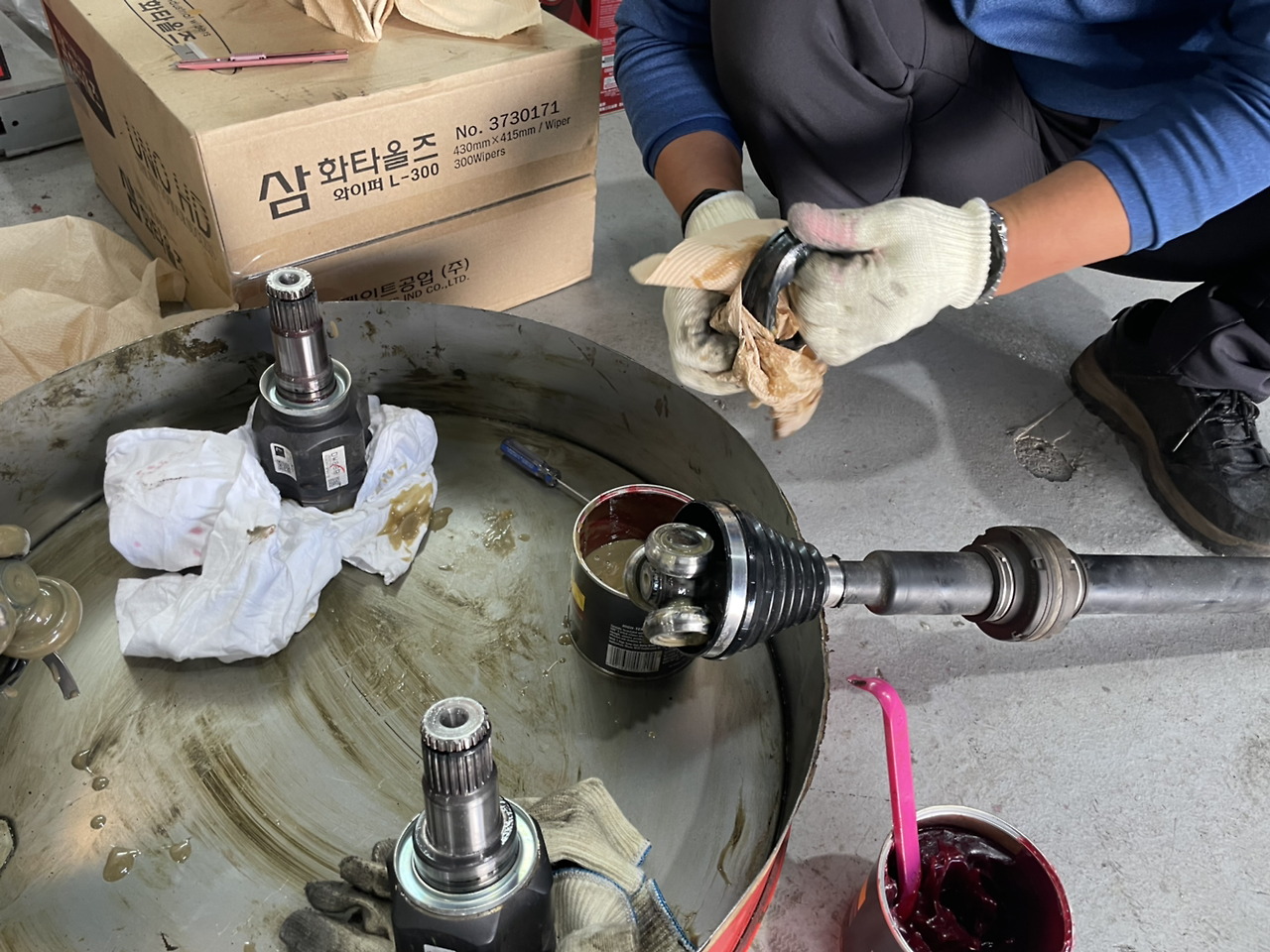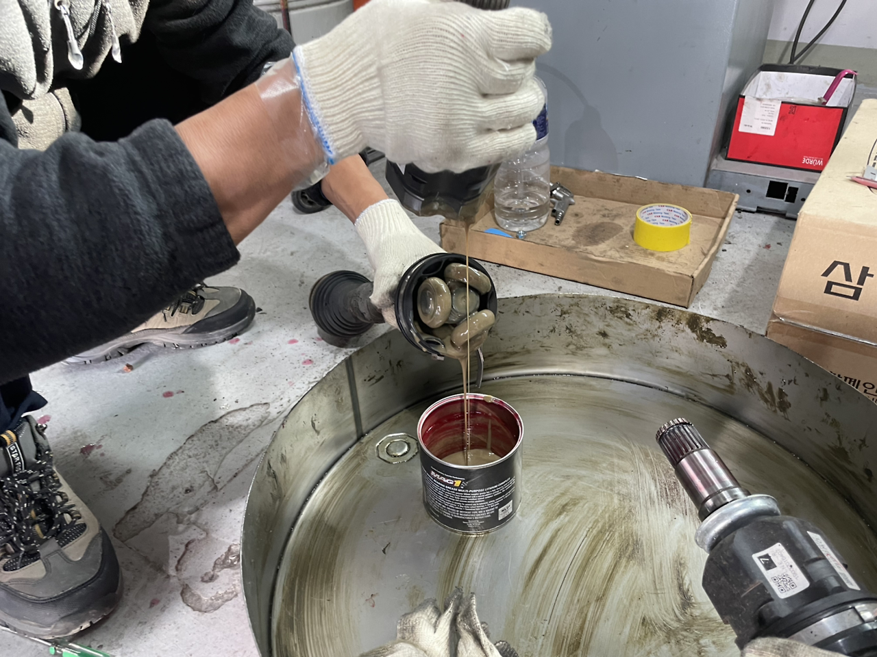 하나씩 분해하고 드디어 등속조인트를 뽑아냈습니다. 한 분이 더 오셔서 같이 분해 준비하십니다. 뚜껑(?)을 따자 갈색 구리스가 주르륵 흘러내립니다. 일부 고체로 남아있는 구리스가 있는 부분도 보여주십니다. 색상은 나름 괜찮은 편이라고 하십니다. 어떤 차는 주행거리가 15만km였는데 구리스가 완전 액상화되어 검정색으로 흘러내렸다고 합니다.