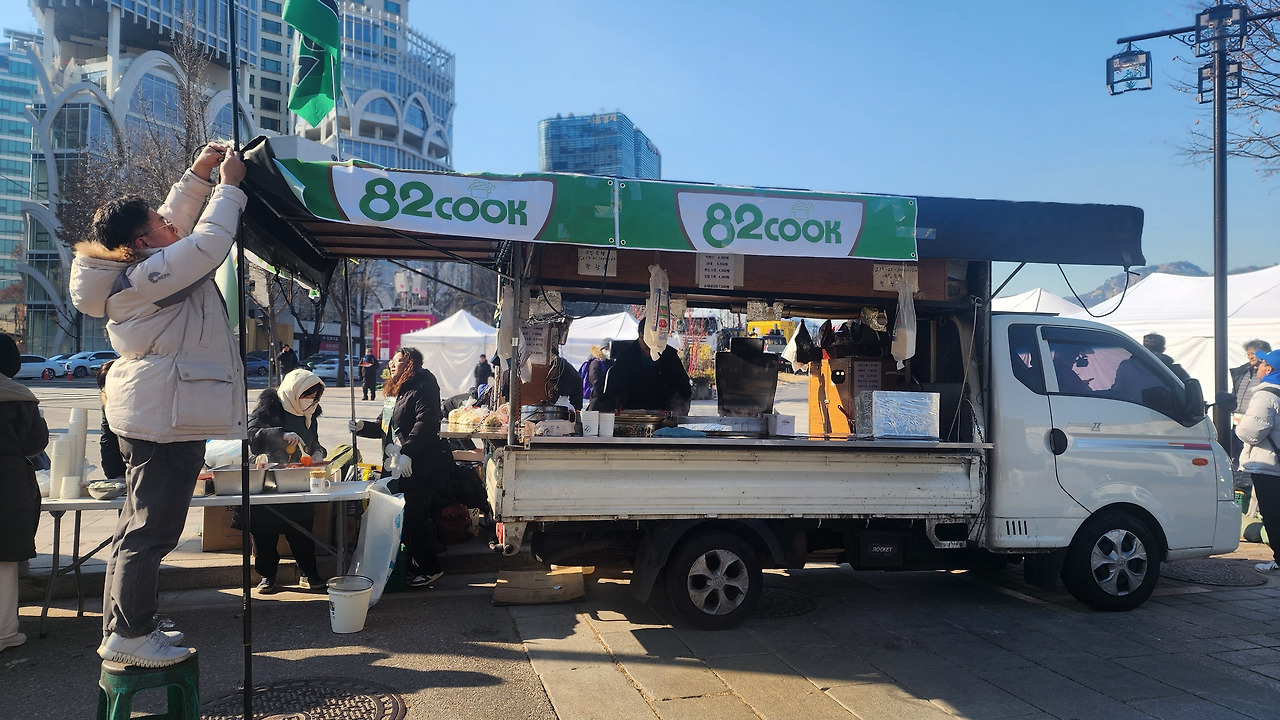 < 떡볶이 나눔 푸드 트럭 82 cook 봉사자들이 집회 전 준비 하는 모습 >