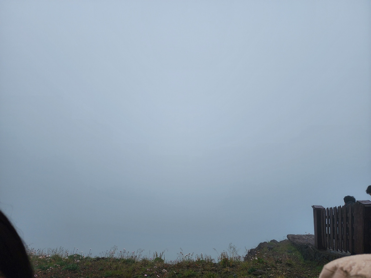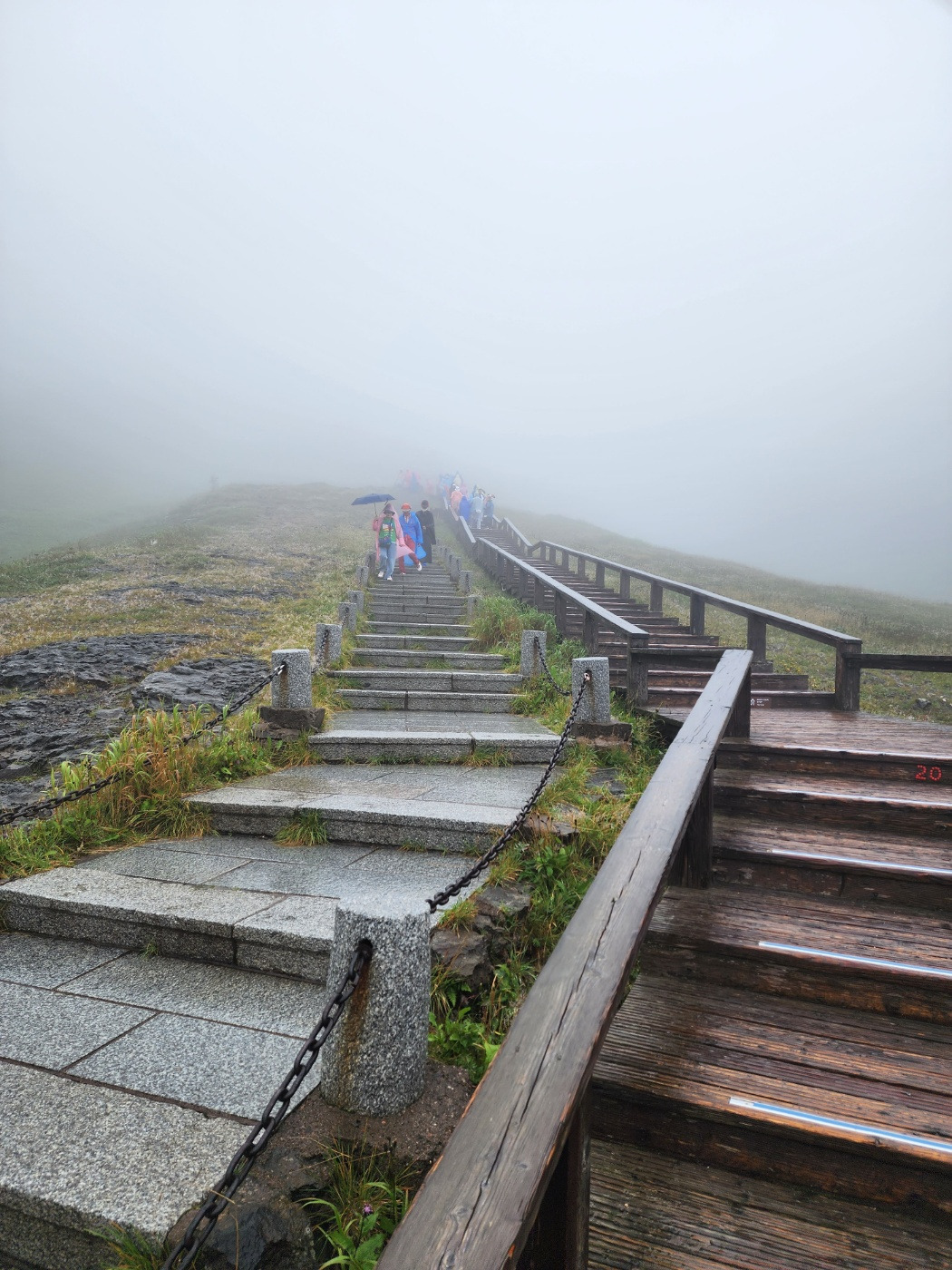 백두산은 날씨가 변덕스러워 천지를 볼 수 있는 맑은 날은 그리 많지 않다고 한다. 맑게 개인 천지를 보는 것은 정말 행운이 따라야 한다고 말할 정도이다. 내가 아는 어떤 분은 백두산을 10번이나 다녀 왔지만 단 한번도 천지를 보지 못했다고 했다. 우리 일행은 8월 14일은 서파로 15일엔 북파로 두 번 천지에 올랐다. 14일은 서파로 올랐는데 완만한 나무 계단이 이어져있어 올라가는 것이 그리 힘들지는 않았지만 안타깝게도 비가 계속 내리고 안개마저 자욱하게 끼어 있었다. 서파 꼭대기까지 1442개 계단을 오르며 어서 안개가 걷히기만을 기도했지만 결국에는 뽀얀 안개만 실컷 구경하고 내려와야만 했다.