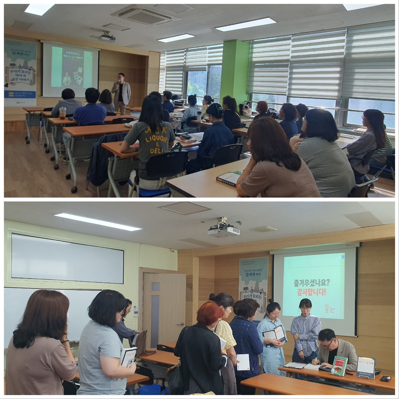< 강연하는 모습과 강연 후 사인회 모습 >