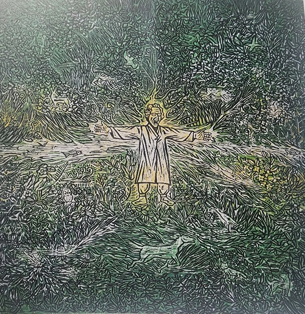 < 류연복 작가 '숲 - 늦봄 ' : 6장의 판화를 겹쳐 찍은 작품으로 문익환 목사의 모습을 십자가로 표현 >