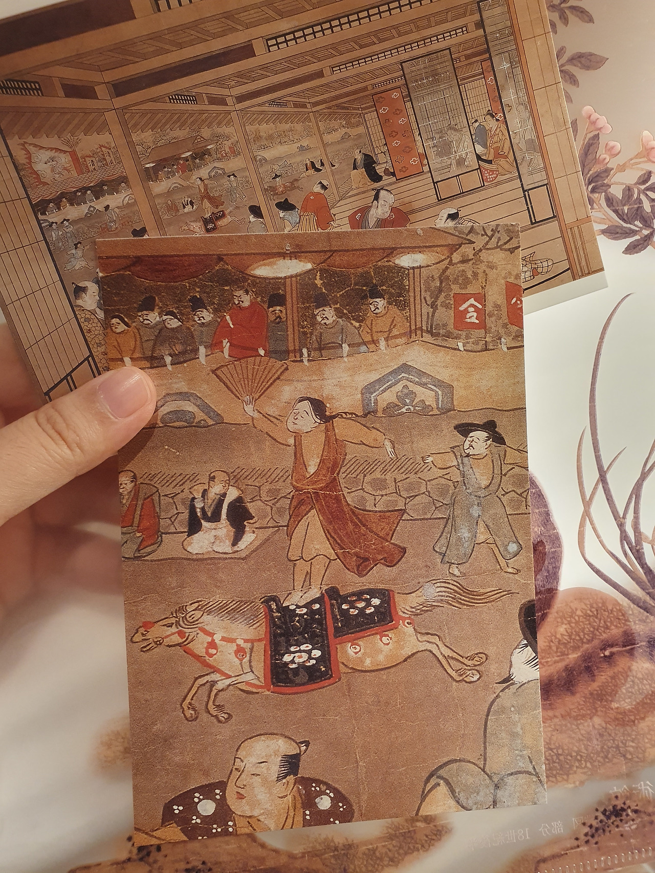 1748년 그린 <마상재도>는 일본의 요청에 의해 조선통신사 일행에 합류한 곡마기수, 마상재와 곡예를 즐기는 당주와 그 부하들이 담긴 그림이다. 1층 전시공간은 사진 촬영이 금지되어 따로 구입한 아래의 엽서 이미지로 대신한다. 그림에서 재미있는 점은 사무라이들의 표정이 하나같이 억울하고 우울해 보인다는 것이다.