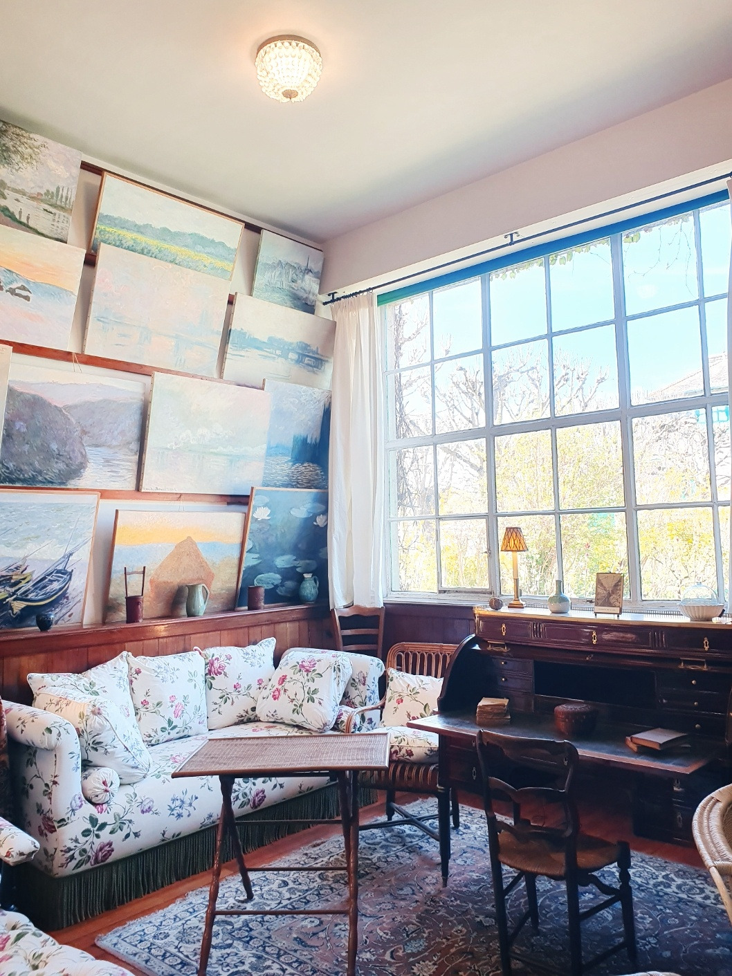 2층으로 올라가면 모네와 가족들의 침실 공간이 있다. 출입이 막혀 관람객에게 공개되지 않은 곳은 창고와 관리인의 방이다. 아마도 모네는 1층에서 많은 시간을 보냈을 것이다. 화실, 살롱, 부엌과 식사를 하던 다이닝 공간이 모두 1층에 있다. 각각의 공간이 다 예쁘지만 다이닝룸이 특히 발을 붙잡아 떠나기 어려웠다. 가구와 벽지 모두 노랗게 칠한 다이닝룸은 햇볕이 없는 시간에도 이미 물들어버린 것 같았다.