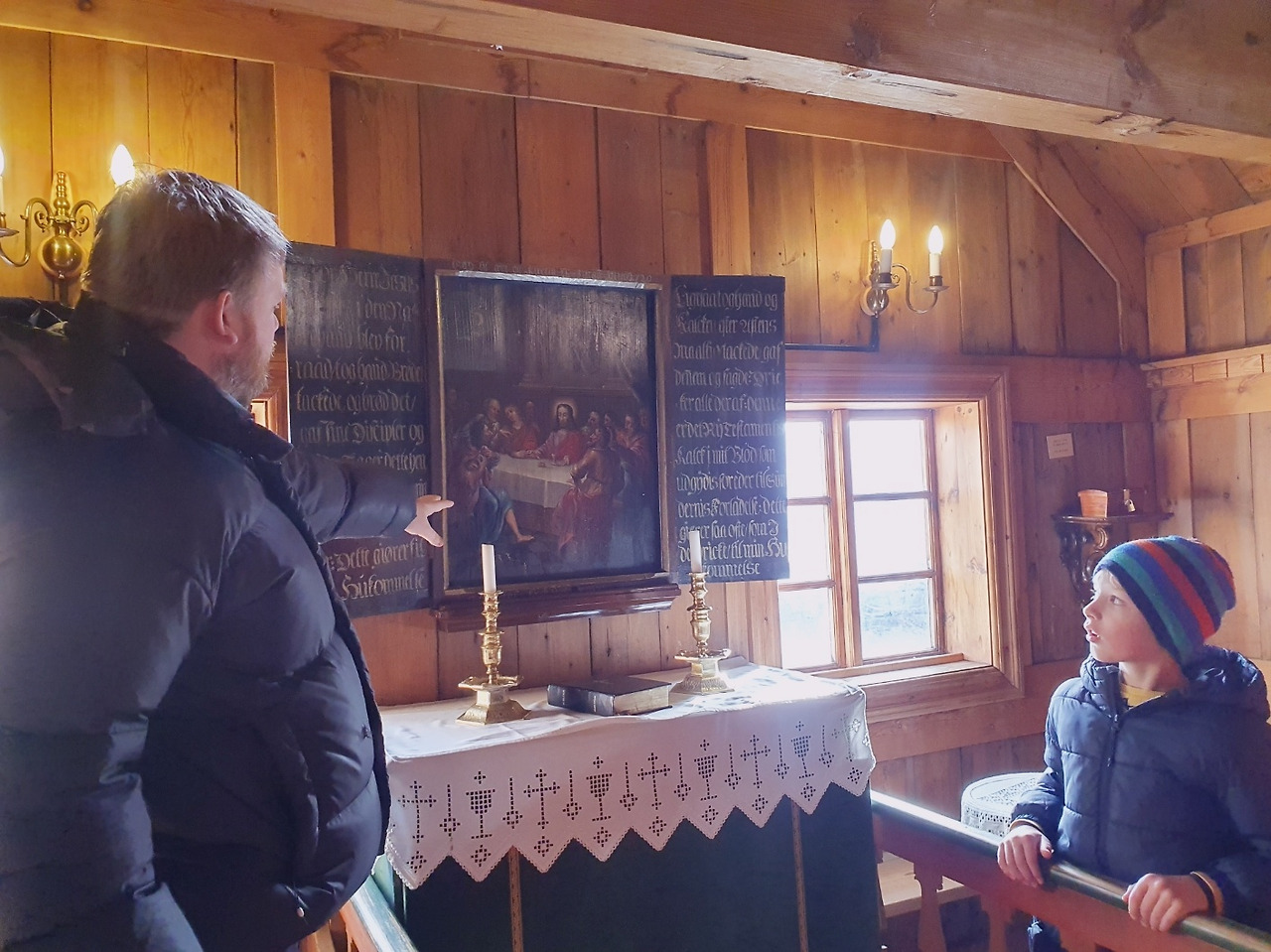1842년 세워진 루터교 교회 건물에서 가이드가 제단화에 대해 상세하게 설명하고 있다.