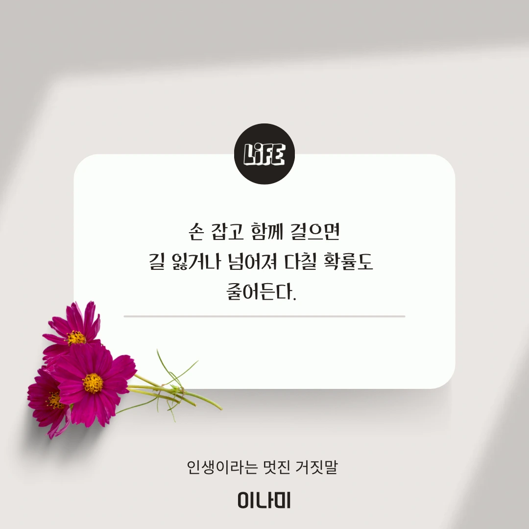 늙을수록 부부는 꼭 손을 붙잡고 다니란다. 금실이 좋아서가 아니라 손을 잡아야 넘어져도 상대가 잡아줄 수 있으니 일종의 안전장치라는 말씀에 기운이 빠진다.