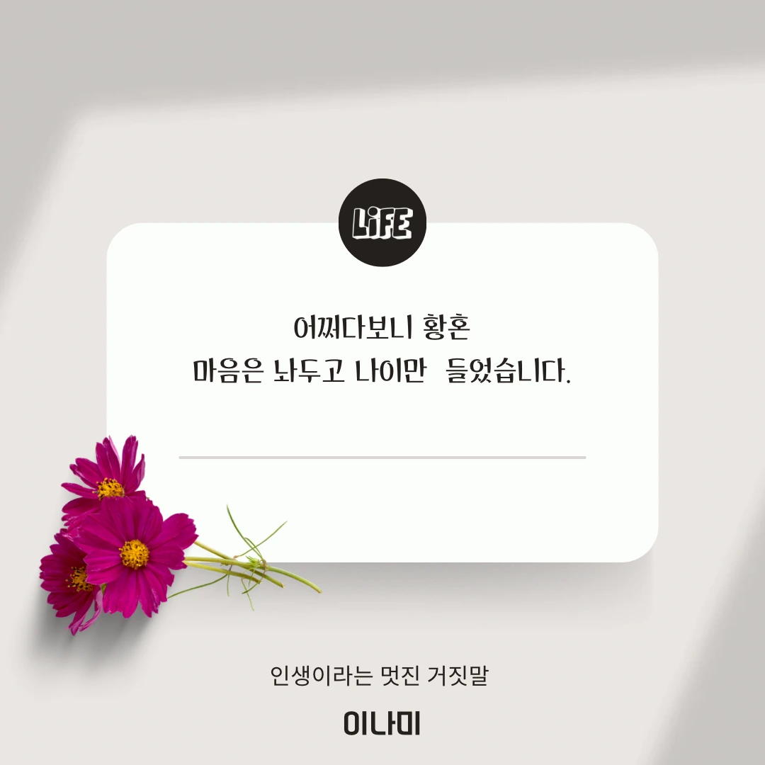 어쩌다 보니 황혼, 마음은 놔두고 나이만 들었다는 이나미 작가님 말씀처럼 나만 내 마음은 언제나 이팔청춘이라고 노래를 부른 것은 아닌가 보다. 그야말로 어쩌다 보니 황혼 길에 접어들었지만 여전히 마음은 그대로인 것이 제대로 늙어가는 것인지 아니면 주책스러운 늙은이가 되어가는 것인지 감을 잡을 수가 없다.