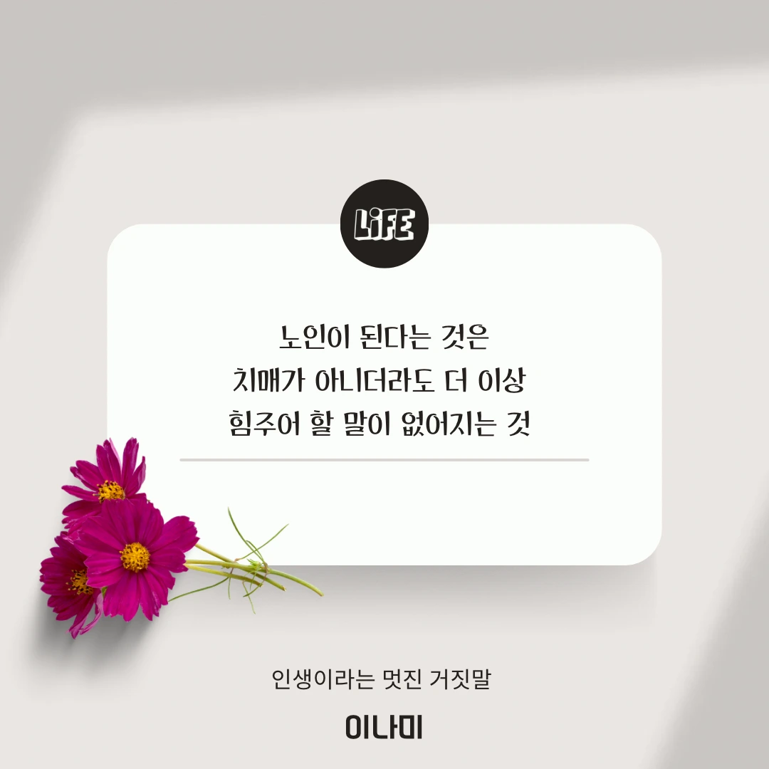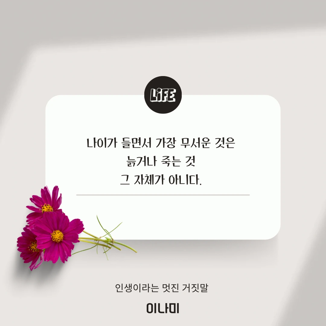나이가 들면서 가장 무서운 것은 늙거나 죽는 것이 아니라고 이나미 작가님은 말씀하신다. 그보다는 “그 사람, 왜 빨리 죽지 않지?”그런 소리를 들을까 봐 무섭단다. 더 이상 쓸모가 없거나 남들한테 민폐나 끼치는 그런 존재가 될까 봐 두려운 것이다.