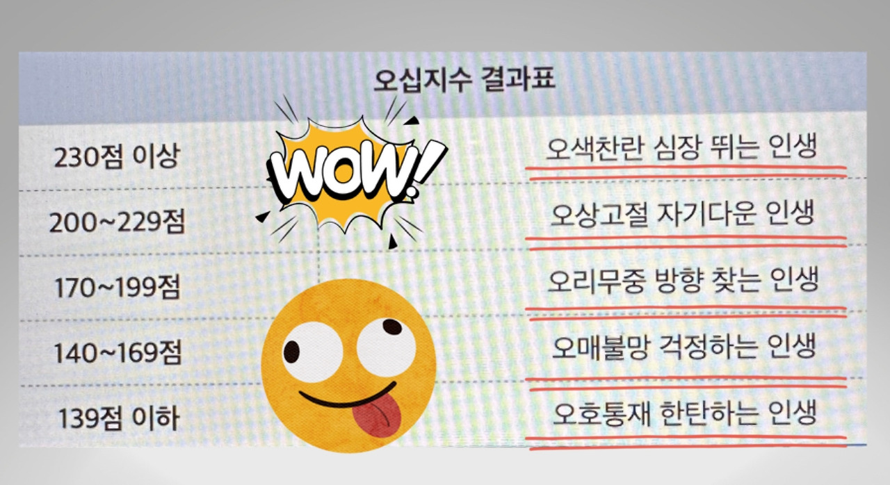“오색찬란 심장 뛰는 인생”은 몸과 정신이 모두 건강할 뿐만 아니라 감성이 풍부하고, 인간관계도 정성을 다하며 행복한 인생을 살아가는 가장 이상적인 중년의 삶이란다. 아마 내 나이가 중년이었으면 이 점수가 안 나왔을 것 같다.