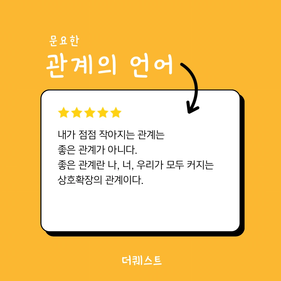 내가 점점 작아지는 관계는 좋은 관계가 아니라고 작가님은 말씀하신다. 좋은 관계라는 것은 나, 너, 그리고 우리 모두가 함께 커지는 상호확장의 관계라는 말씀에 요즘의 사람들의 관계에 대해서 다시 한번 생각해 보게 된다.