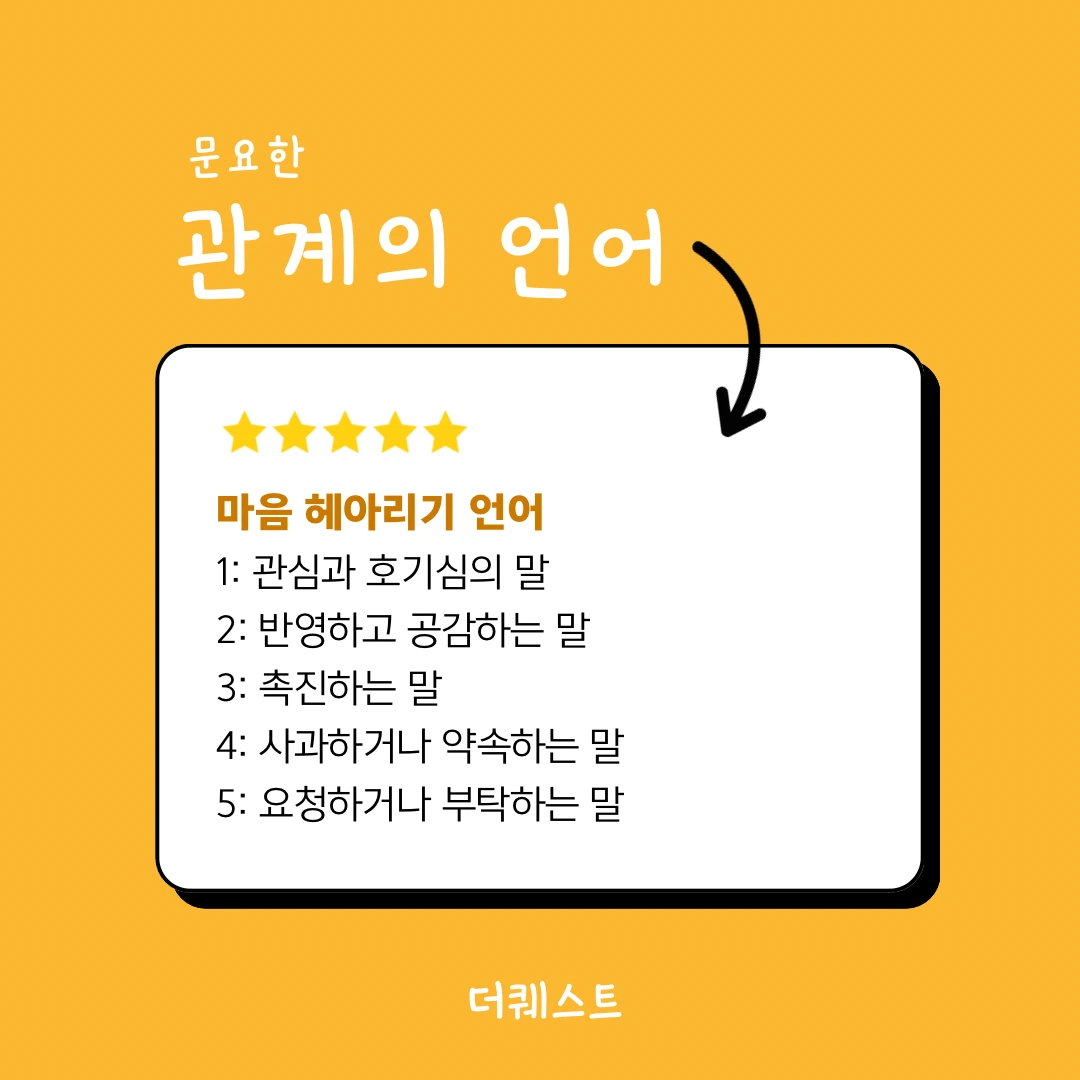 “마음이 좀 어때?”라는 관심과 호기심의 말이 있고, “그때 참 힘들었겠다.”라고 말하는 반영하고 공감하는 말이 있으며 “좀 더 얘기해 줄 수 있어?”라고 물어보는 촉진하는 말도 있고, “그 부분은 미안해.”라고 말할 수 있는 사과하거나 약속하는 말이 있으며, “나는 네가 이렇게 해줄 때 참 좋아.”라고 넌지시 말하는 요청하거나 부탁하는 말이 있단다.