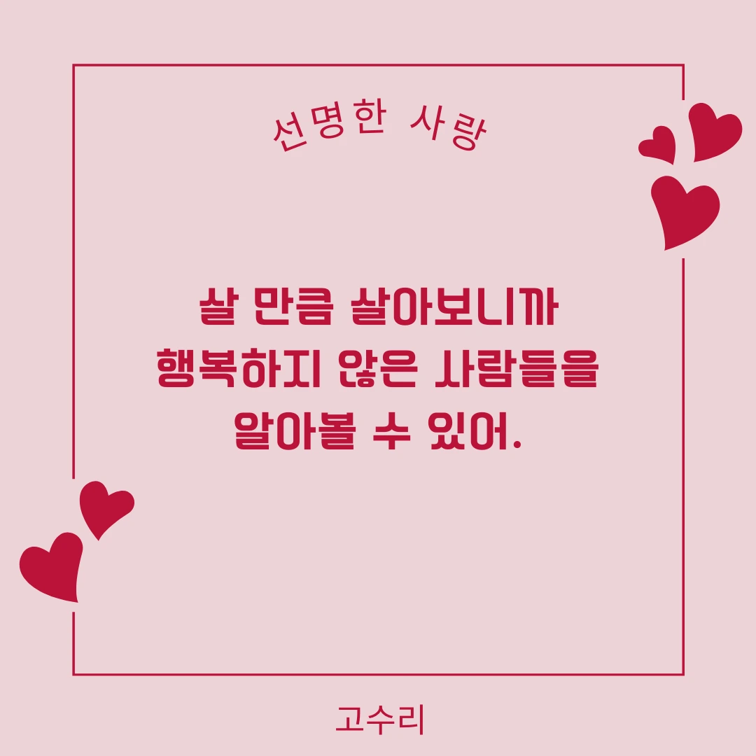 이렇게 마음을 따스하게 달래주는 말들이 참 그리웠다. 너무 오랫동안 자기 계발서랑 에세이 위주로 책을 읽다 보니 이런 정서적인 면이 약간 메말라지는 것 같았는데 같은 에세이이면서도 고수리 작가님의 《 선명한 사랑 》이라는 산문집은 달라도 너무 다르다.