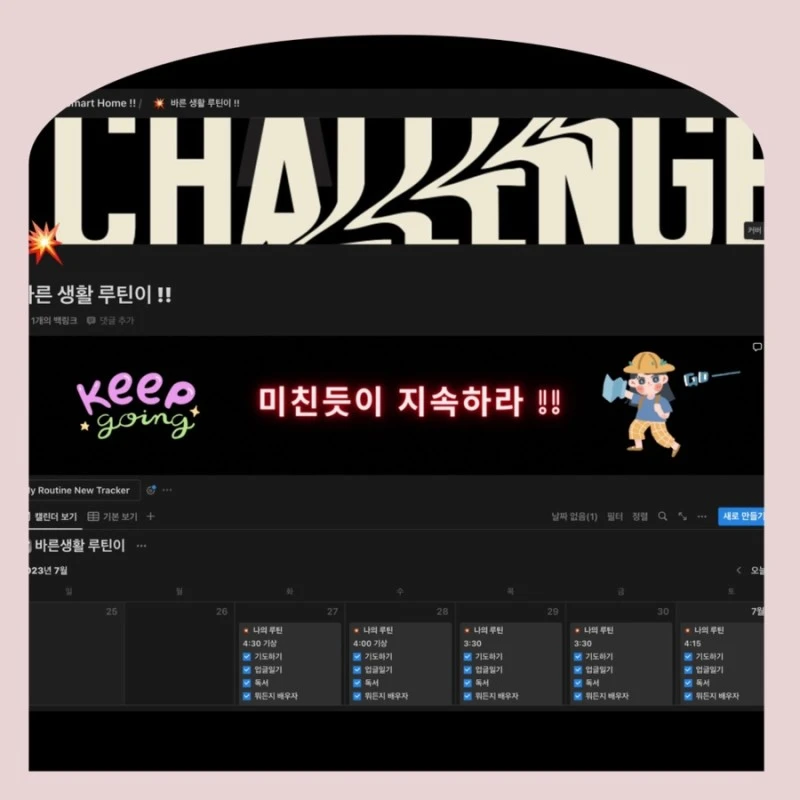 그래도 그 바람에 얼마 전부터 부지런히 유튜브 보면서 공부해 뒀던 “노션”을 통해서 이렇게 “바른생활 루틴이”라는 페이지를 만들어 하루하루 아주 열심히 살고 있다.