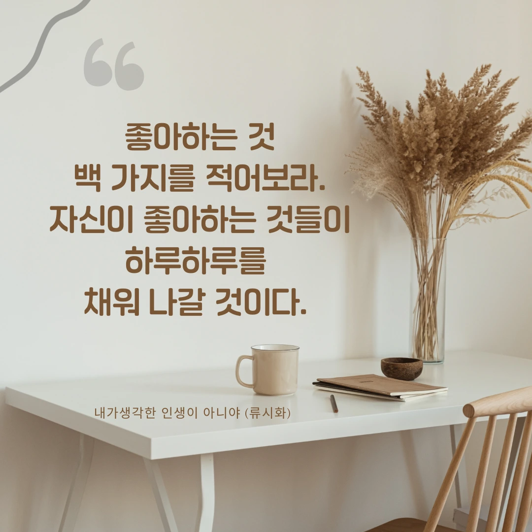 좋아하는 것 백 가지를 적어보라고 하신다. 그러면 자신이 좋아하는 것들이 하루하루를 채워나갈 것이라고 작가님은 말씀하신다.