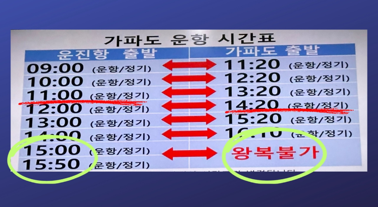 예를 들어서 운진항에서 9시에 배를 탔으면 가파도에서는 11시 20분에 떠나야 한다. 우리는 11시에 떠나는 배를 타니까 오후 1시 20분에는 떠나야 하는 것이다.