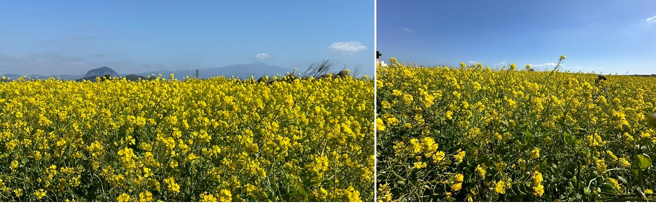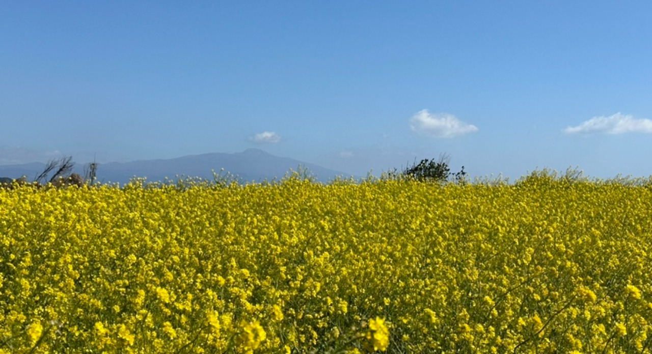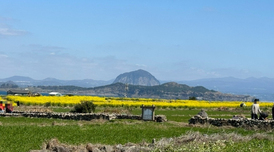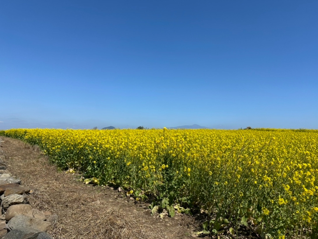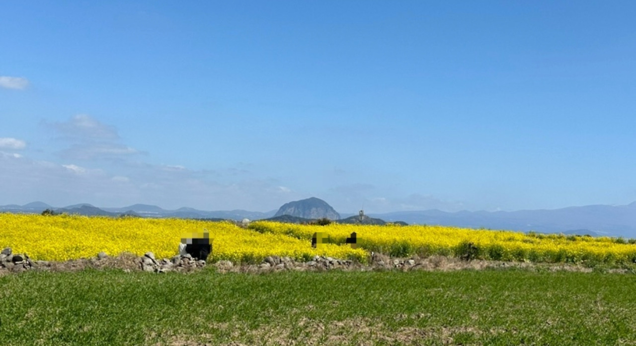 예쁘고 화사하게 피어있는 유채꽃밭 맞은편에는 그 유명한 청보리가 기지개를 피고 있다. 다음 달인 4월부터 5월까지는 이 청보리가 또 대세를 이룰 것 같다.