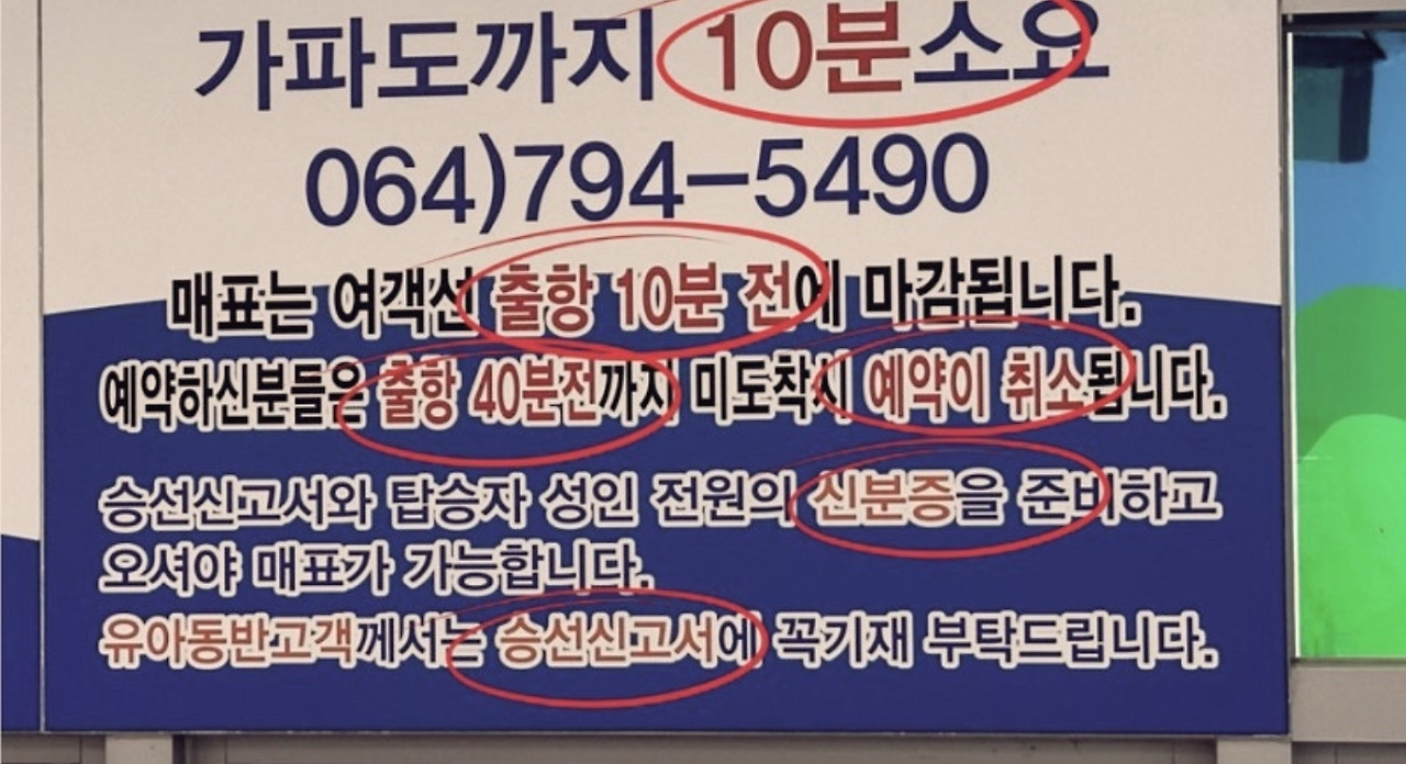 간단히 승선 신고서를 적성하고 어제 전화로 예약한 표를 구했다. 가파도를 구경하러 가기 위해서는 늘 왕복 표를 끊어야 한다. 운진항에서 떠나는 출발 시간에 맞춰 가파도에서 떠나는 출발 시간도 정해지기 때문이다.